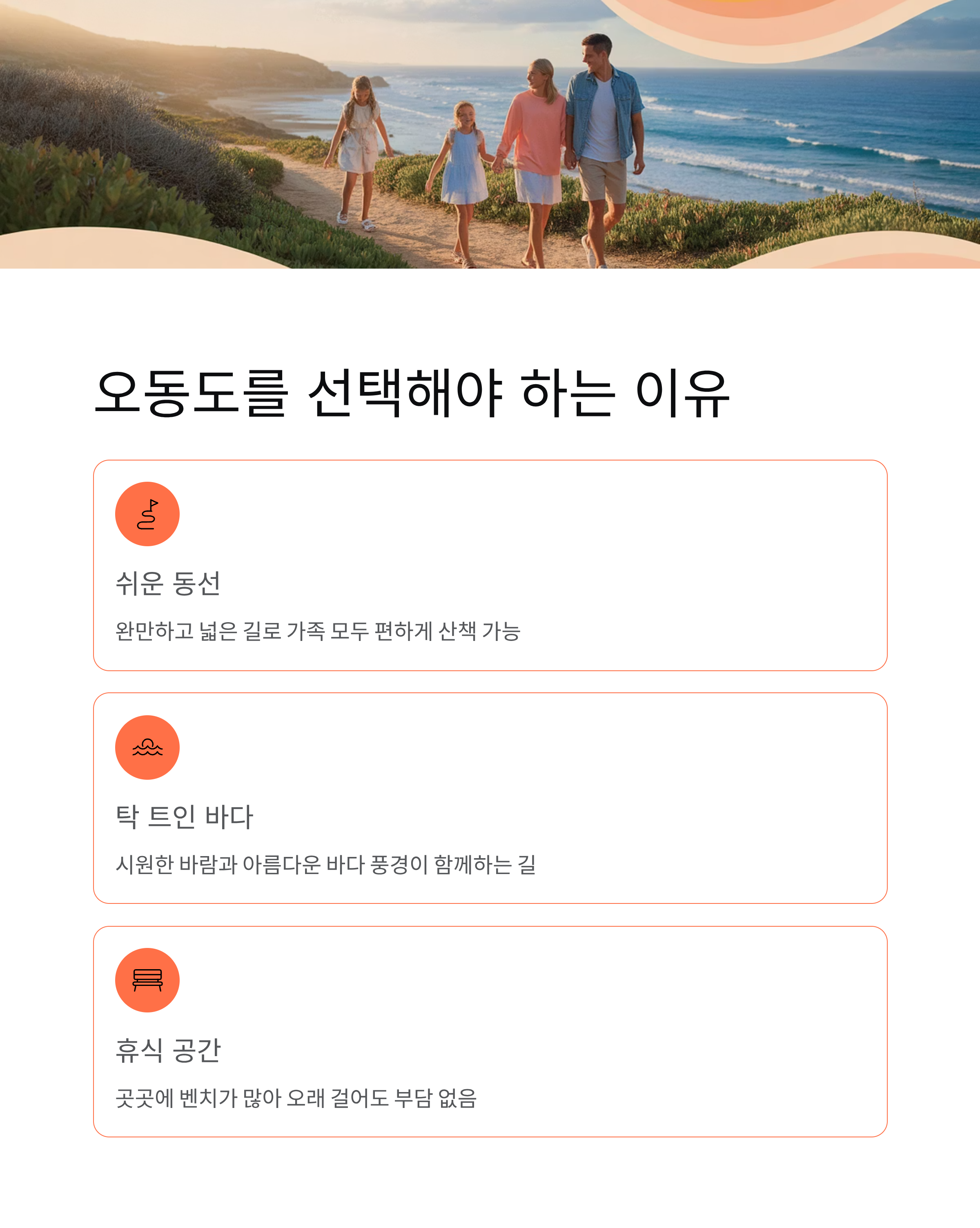입구부터 이어지는 데크길은 바다가 옆을 따라 흐르는 시원한 풍경으로 여행의 첫 느낌을 가볍고 상쾌하게 만들어 줍니다. 아이들과 함께 걸으면 자연스럽게 사진 찍기 좋은 구간들이 계속 나타납니다.