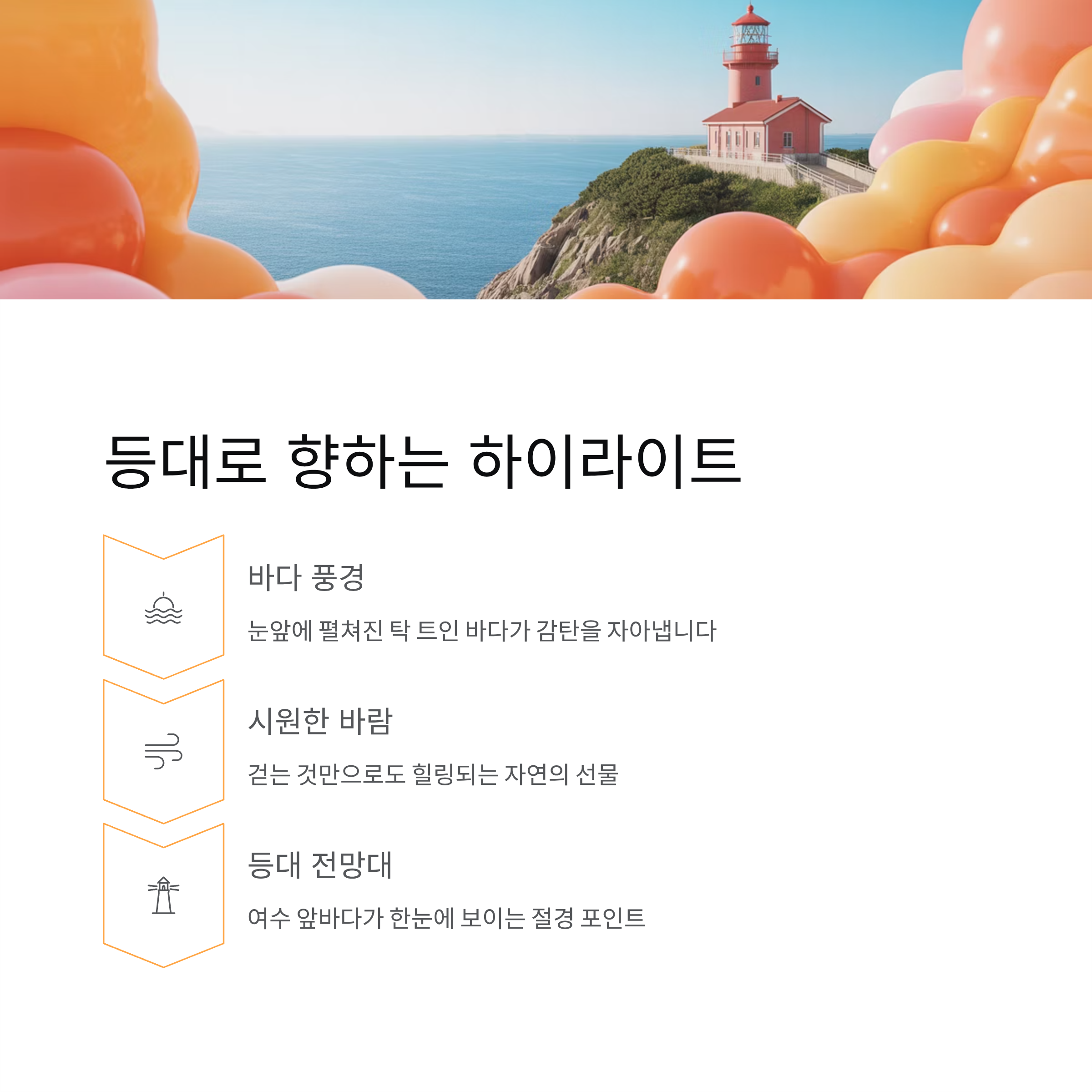 등대에 도착하면 여수 앞바다가 한눈에 펼쳐지는 전망을 만날 수 있습니다. 탁 트인 시야 덕분에 가족 단위로 사진을 남기기 좋고, 잠깐 머물며 쉬어가기에도 편안합니다. 여행 일정 중 가장 감탄이 나오는 포인트이기도 합니다.