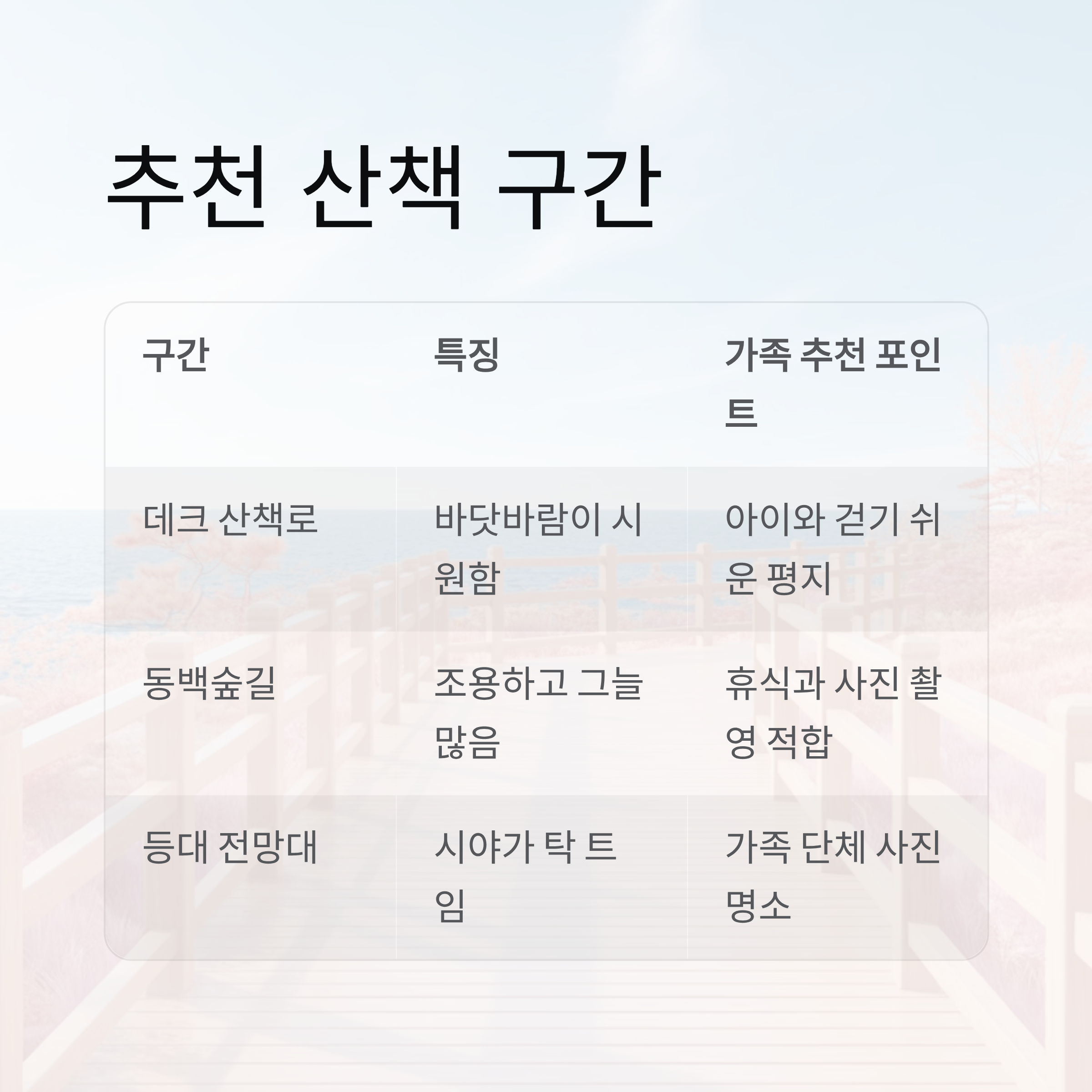 | 데크 산책로 | 바닷바람이 시원함 | 아이와 걷기 쉬운 평지 |