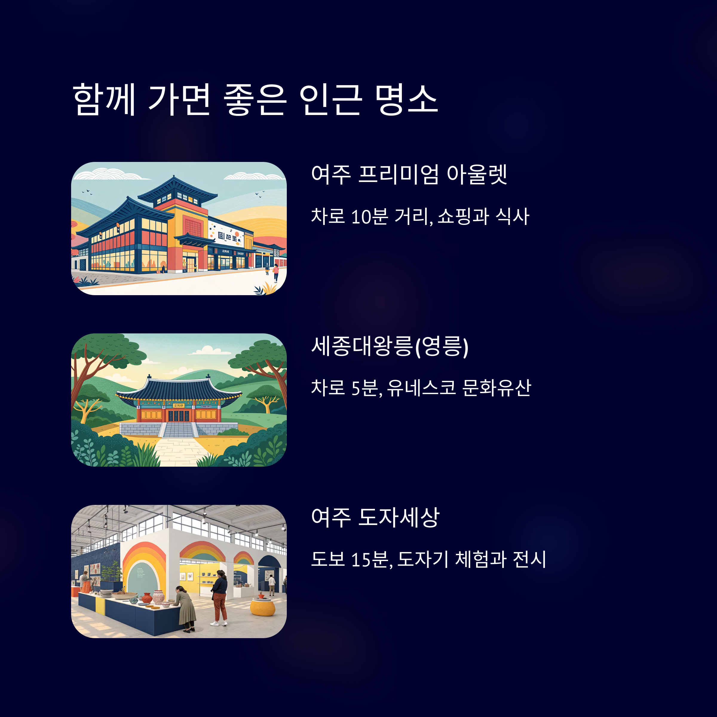 - 세종대왕릉(영릉) (차로 5분): 조선 왕릉 중 대표적 유네스코 문화유산