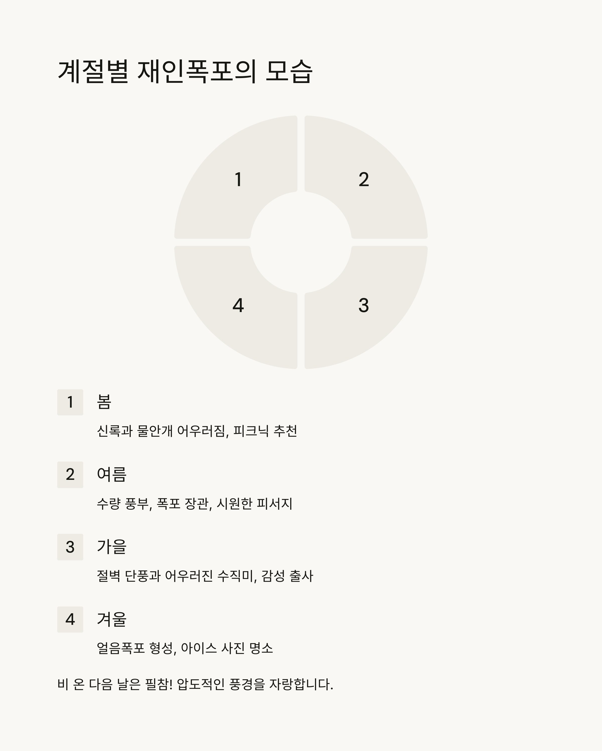 | 여름 | 수량 풍부, 폭포 장관 | 시원한 여름 피서 |