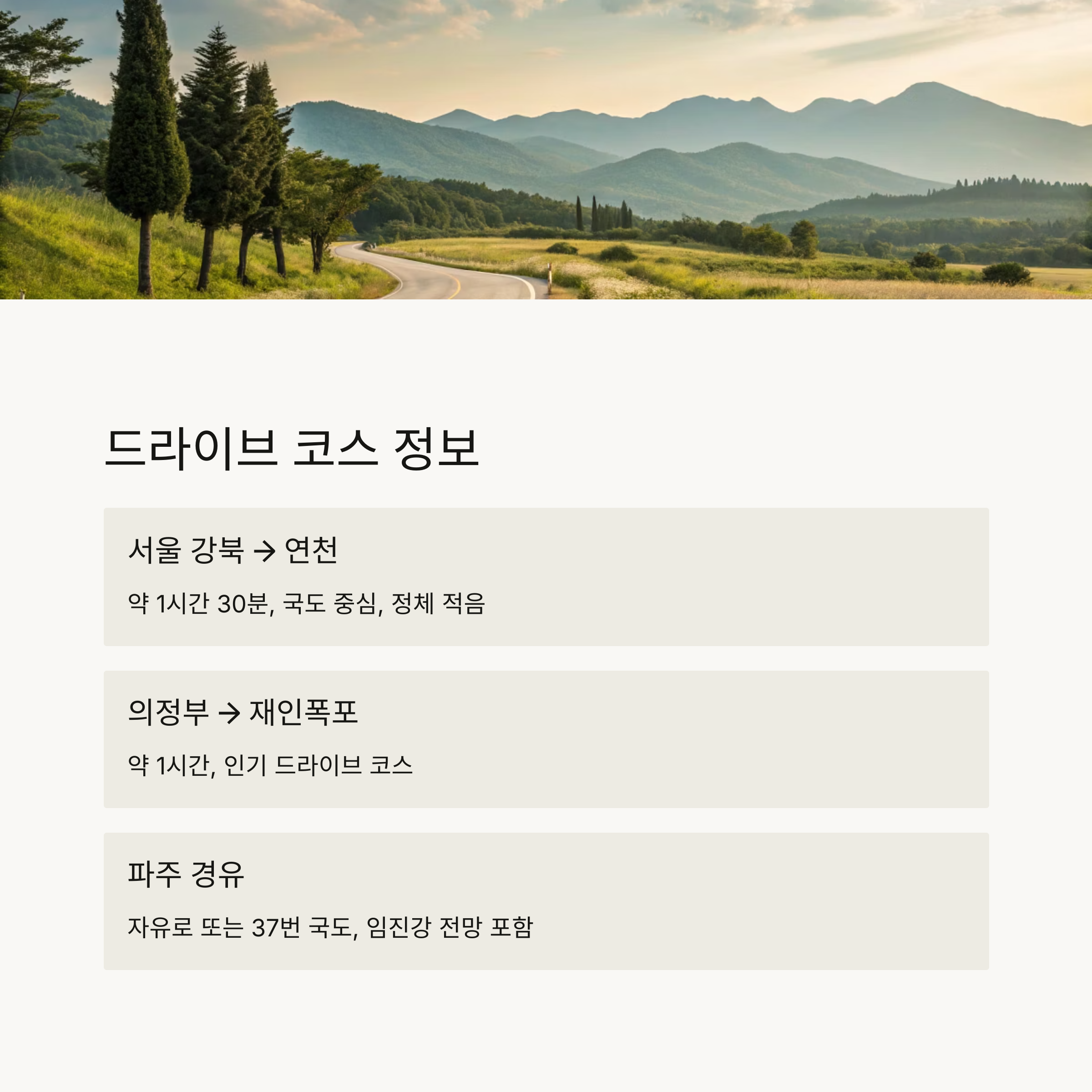 | 서울 강북 → 연천 재인폭포 | 약 1시간 30분 | 국도 중심, 정체 적음 |