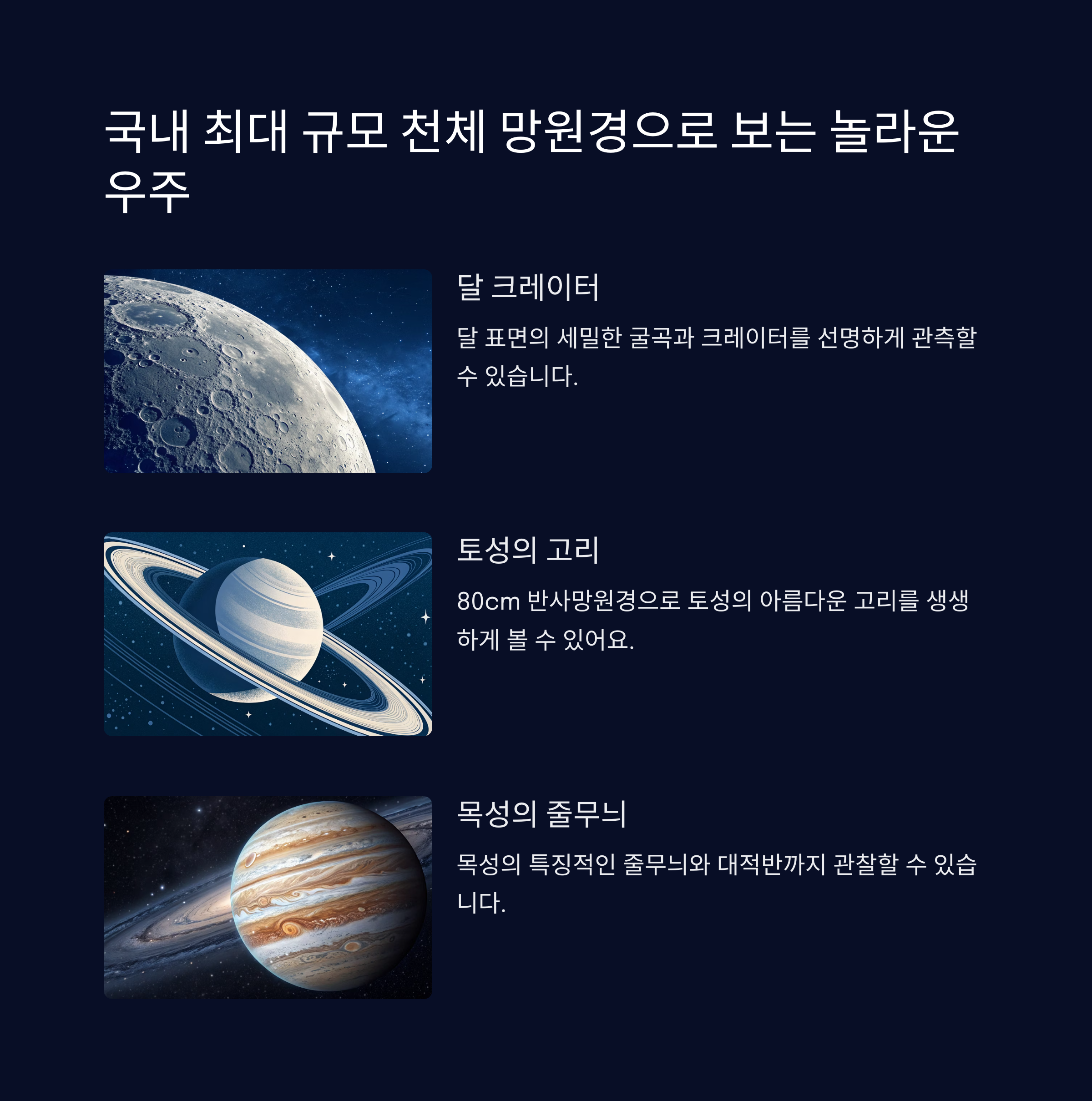 별마로 천문대는 국내 최대 규모의 천체 망원경(80cm 반사망원경)을 보유하고 있어