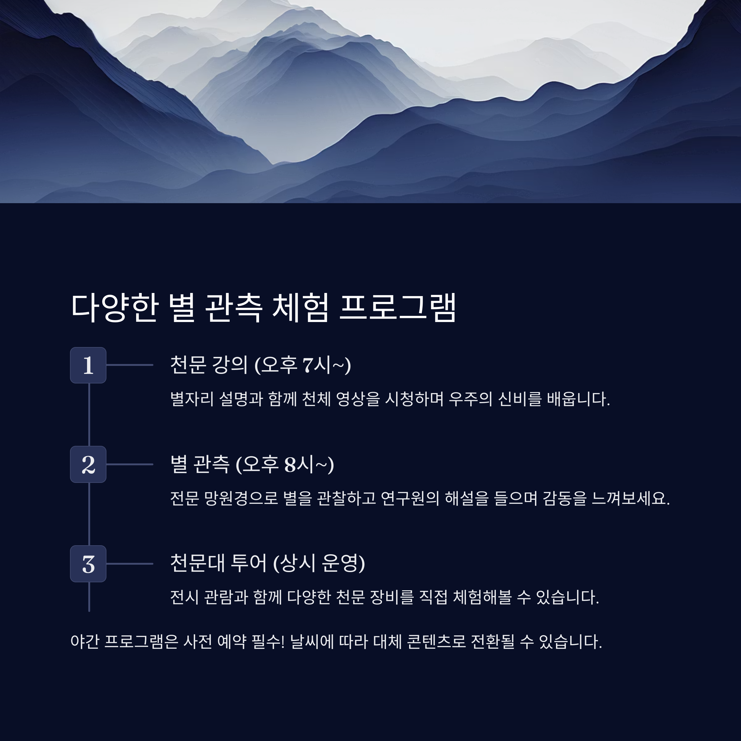| 야간 관측 | 사전 예약 필수 (공식 홈페이지) |