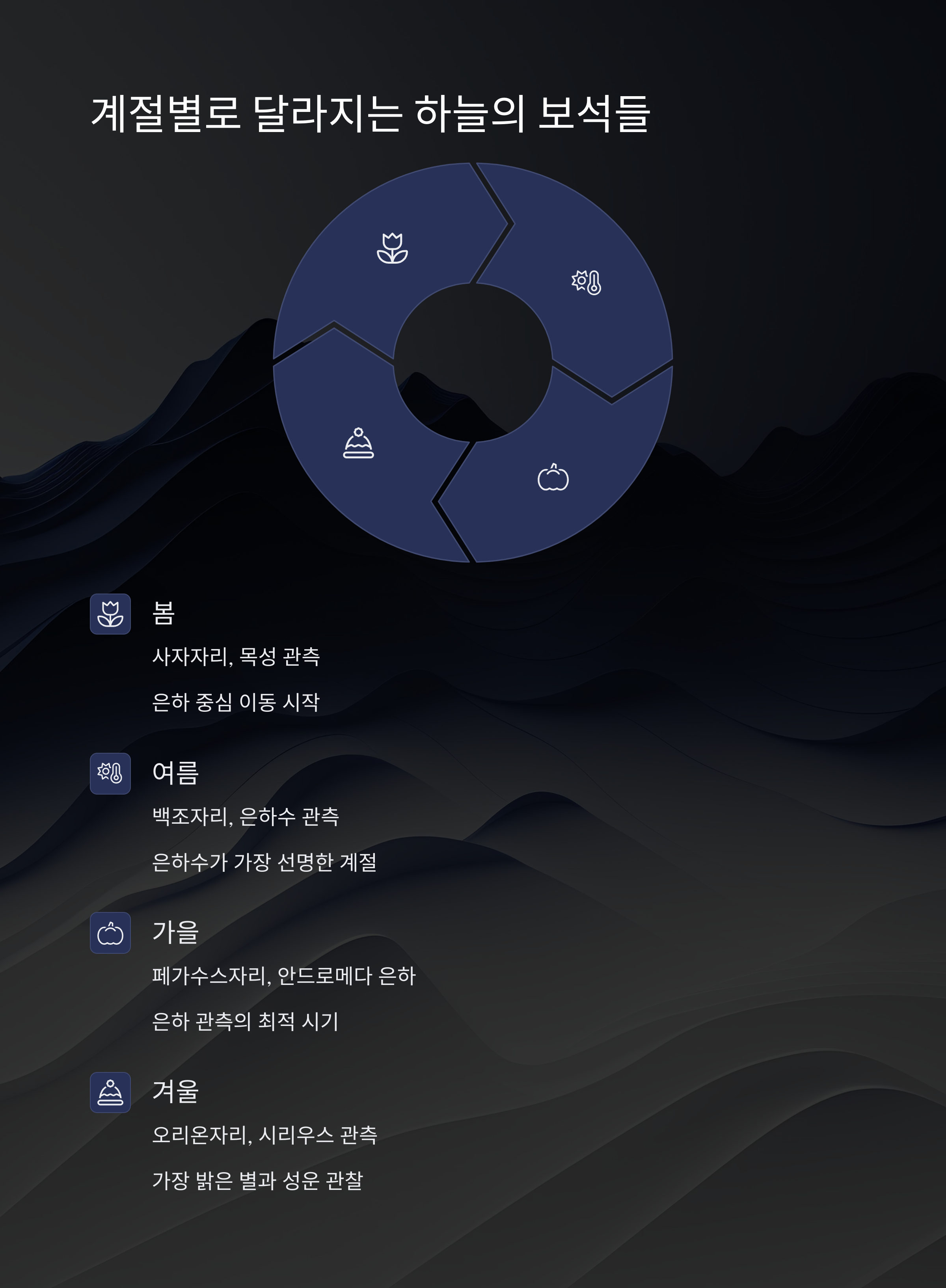 | 여름 | 백조자리, 은하수 | 은하수가 잘 보이는 계절 |