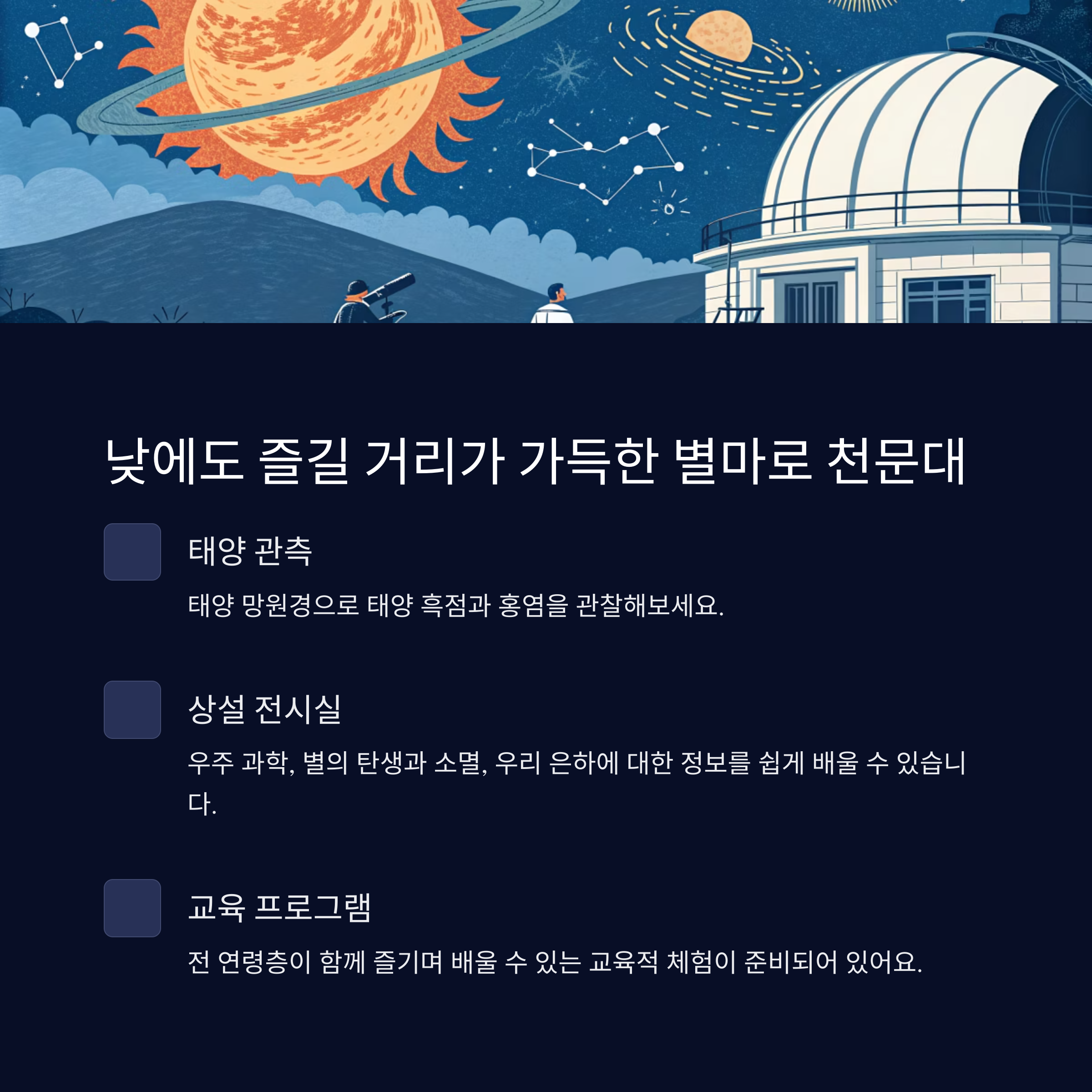 | 천문대 투어 | 상시 운영 | 전시 관람, 장비 체험 가능 |
