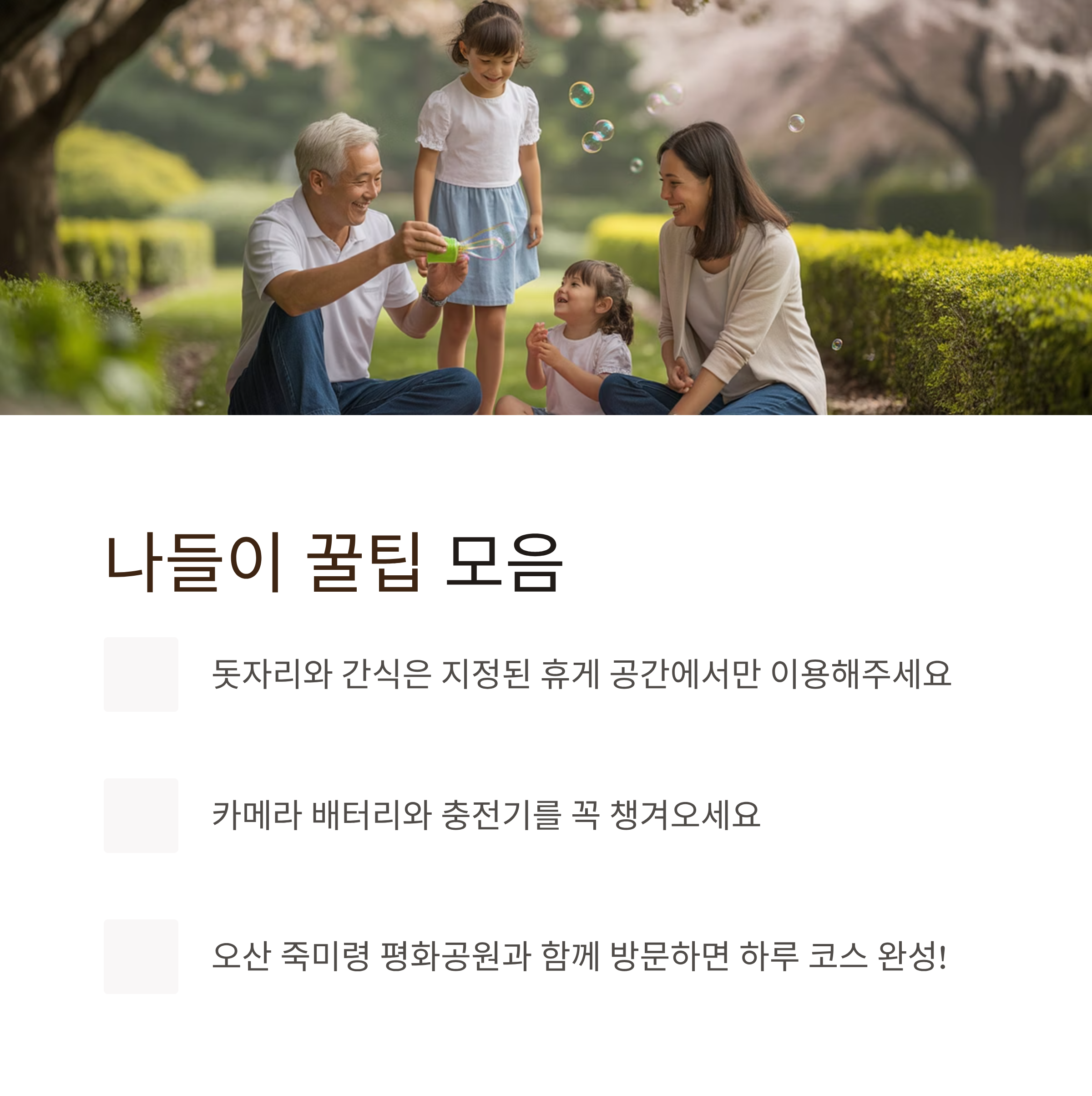 - 돗자리나 간단한 간식은 지정된 휴게 공간에서만 이용 가능