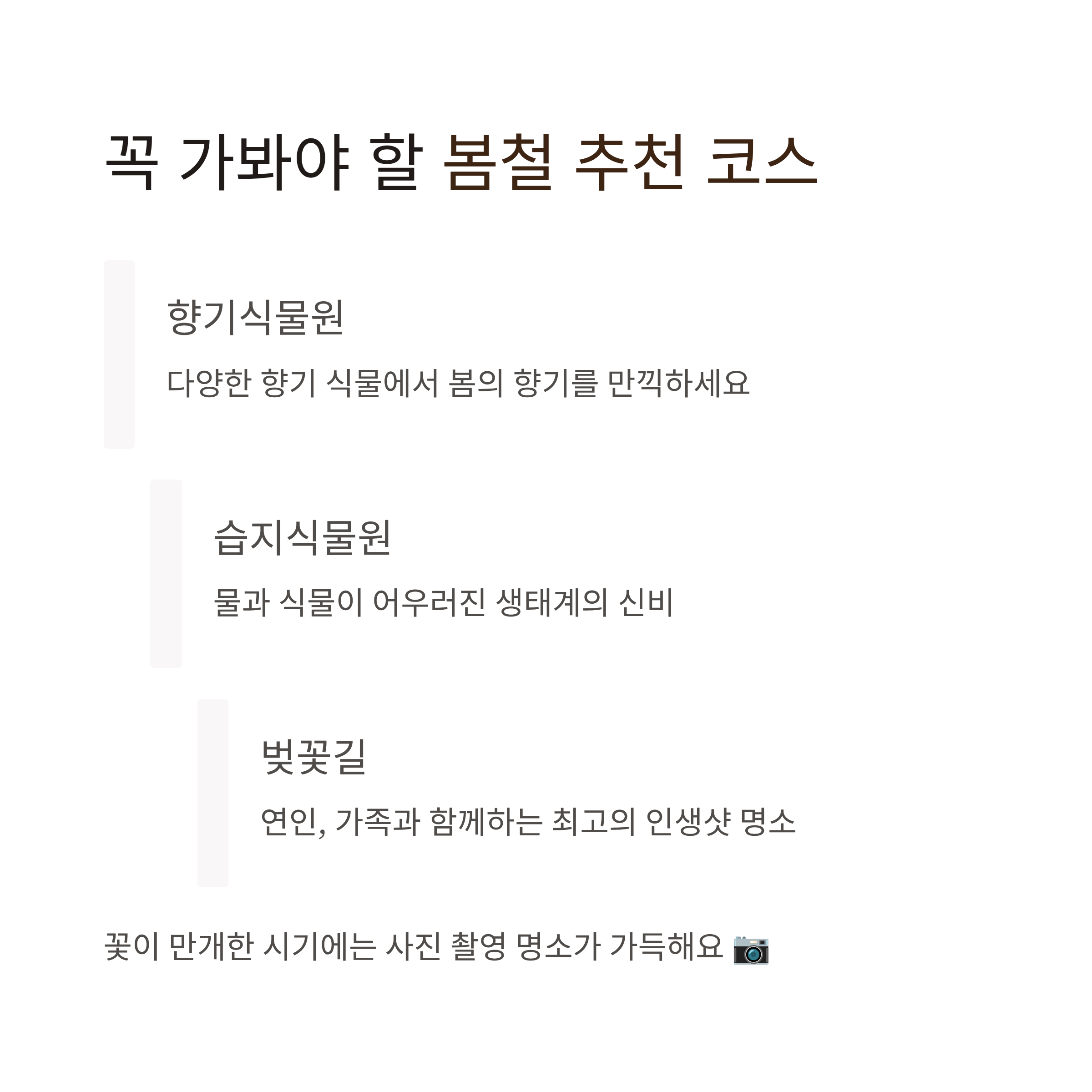 봄철 추천 코스는 매표소 → 향기식물원 → 습지식물원 → 수생식물원 → 벚꽃길입니다.