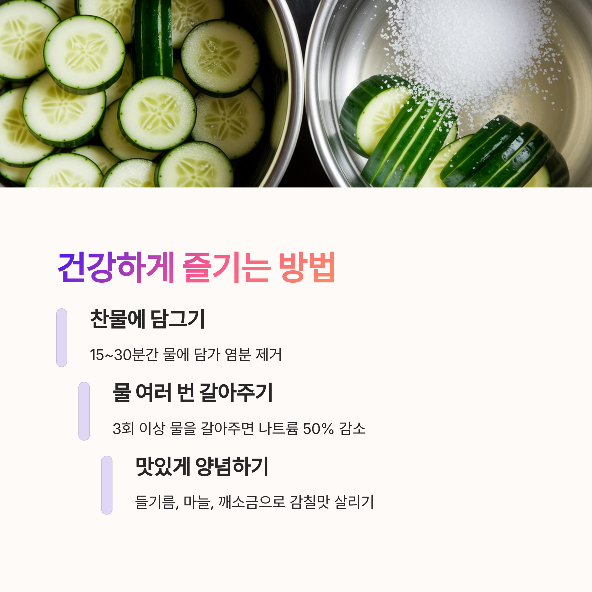 오이지를 건강하게 먹기 위해서는 먼저 짠맛을 충분히 빼는 것이 중요합니다. 물에 10~15분 정도 담가두거나, 끓는 물에 살짝 데친 뒤 찬물에 헹궈 염분을 줄이는 방식이 효과적입니다. 이렇게 하면 나트륨 섭취를 최소화하면서도 오이지의 아삭한 식감과 특유의 풍미를 즐길 수 있습니다. 또한 들기름, 마늘, 고춧가루 등을 활용한 양념으로 조리하면 소금 없이도 충분히 감칠맛을 살릴 수 있습니다.