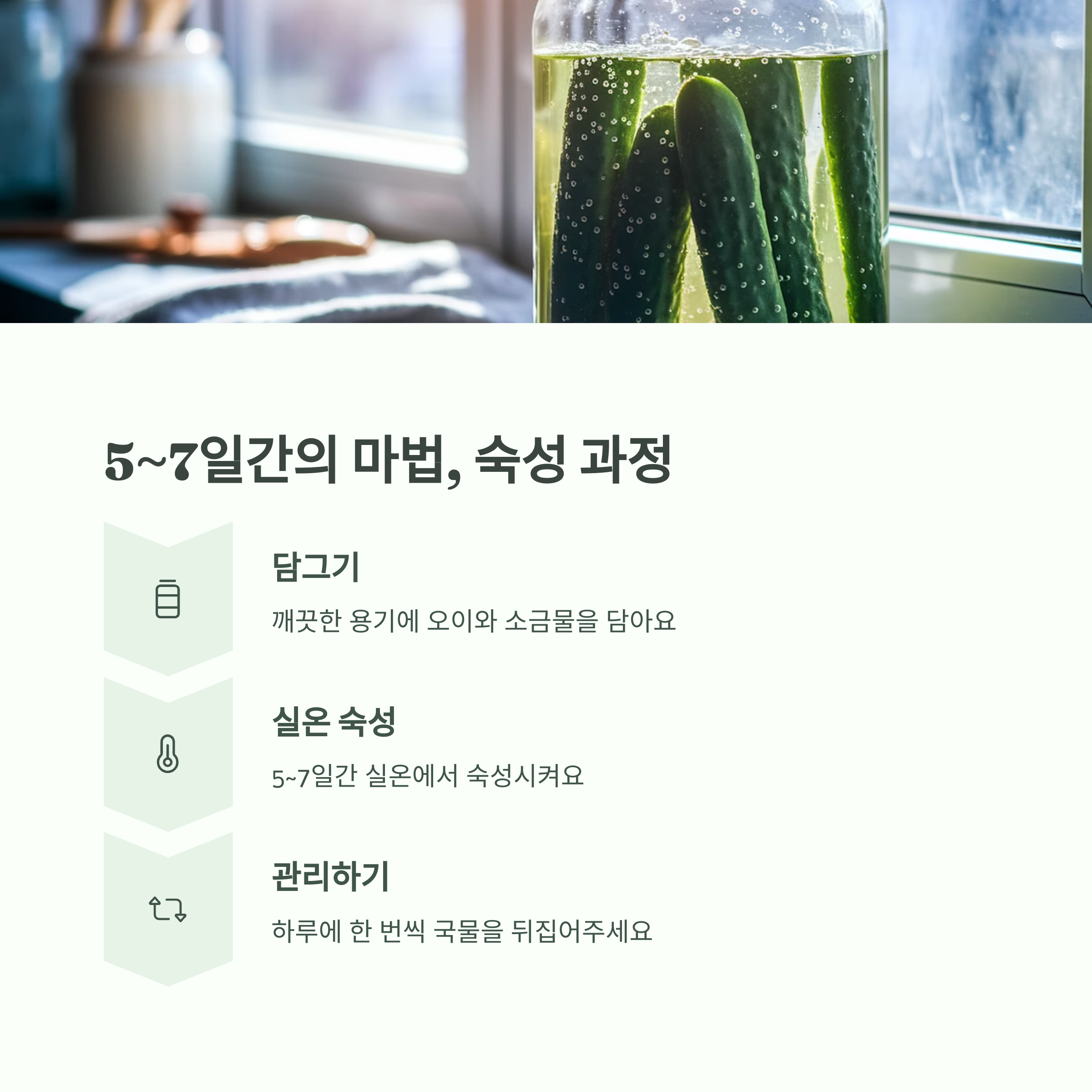 오이지는 끓인 소금물(물 2L당 굵은 소금 1컵 기준)에 깨끗하게 씻은 오이를 넣어 밀봉한 뒤 실온에서 약 5일에서 7일간 숙성시켜야 합니다. 숙성 중간에 무거운 돌이나 누름돌로 눌러주는 것이 아삭한 식감을 지키는 핵심이에요. 숙성이 끝난 후에는 물을 따라내고 냉장 보관을 통해 숙성을 유지하면서 먹으면 됩니다. 이때 남은 절임물은 버리지 말고 재활용하면 추가로 장아찌를 만들거나 무침용으로도 활용할 수 있어요.