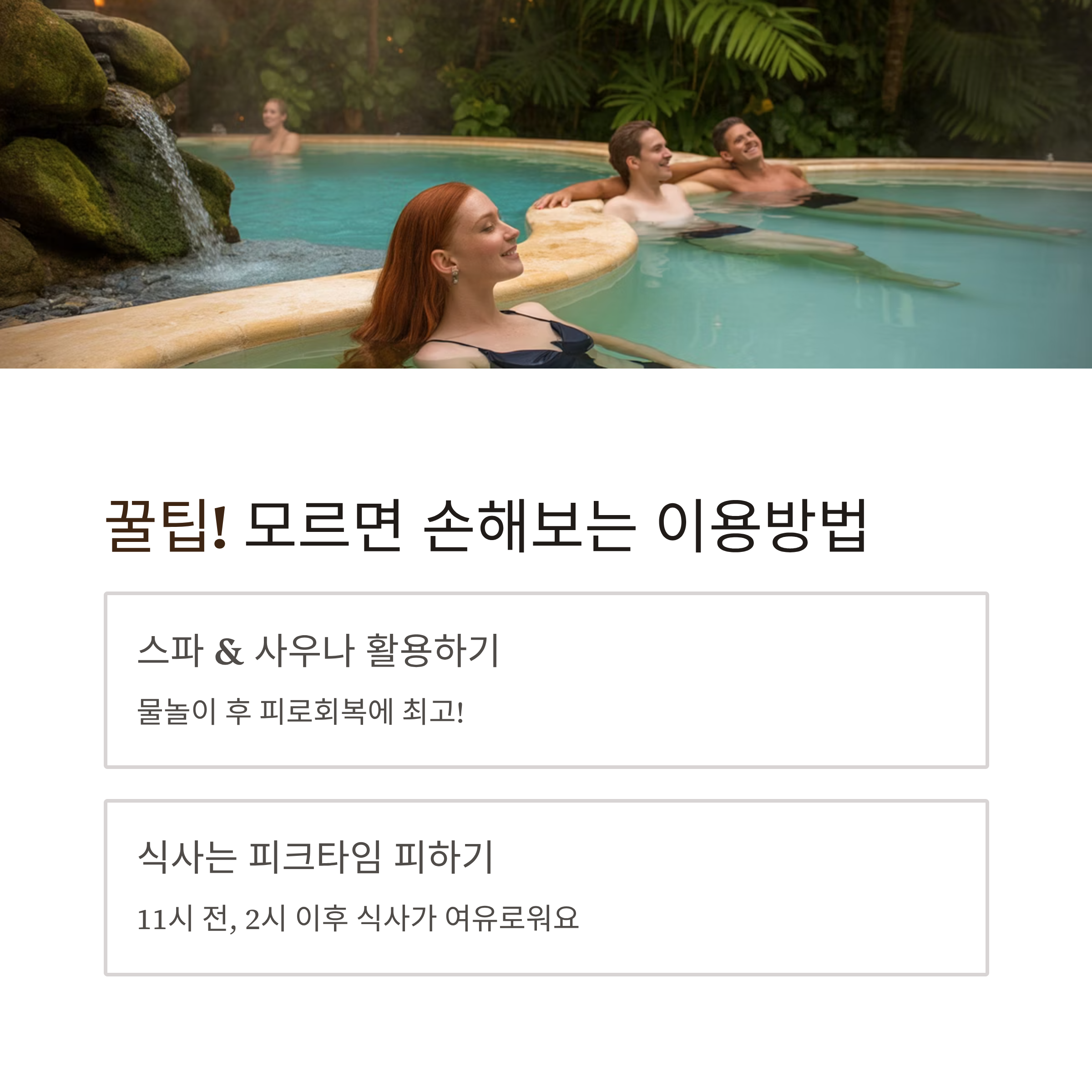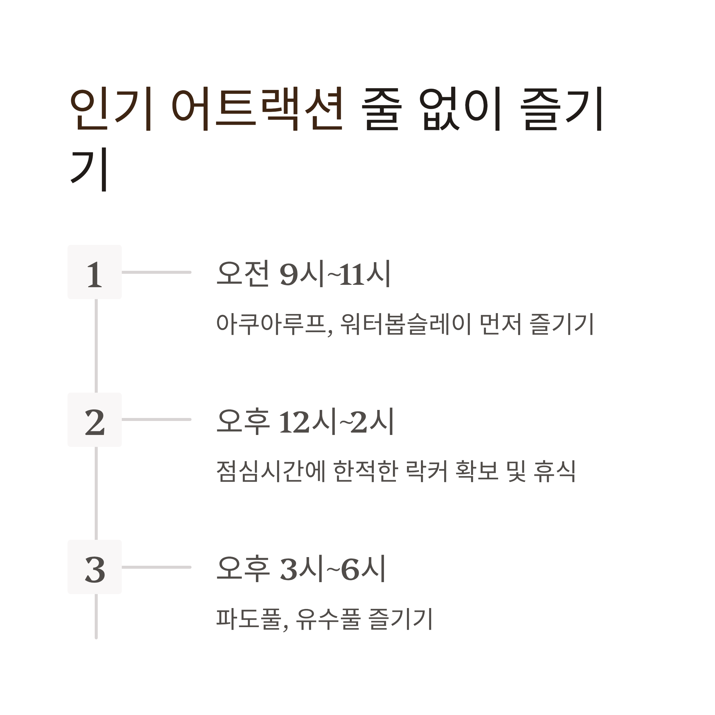 종일권 이용 시 오전에는 스릴 있는 어트랙션, 오후에는 파도풀이나 유수풀 같은 여유 있는 시설을 즐기는 것이 효율적입니다.