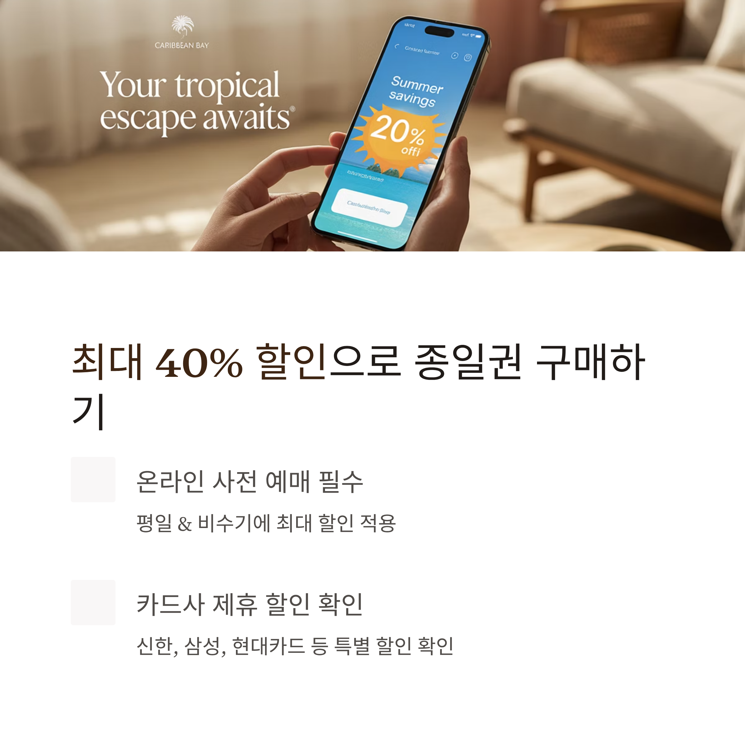 온라인 예매 사이트나 카드사 제휴 이벤트를 활용하면 현장 구매보다 저렴하게 종일권을 확보할 수 있습니다.