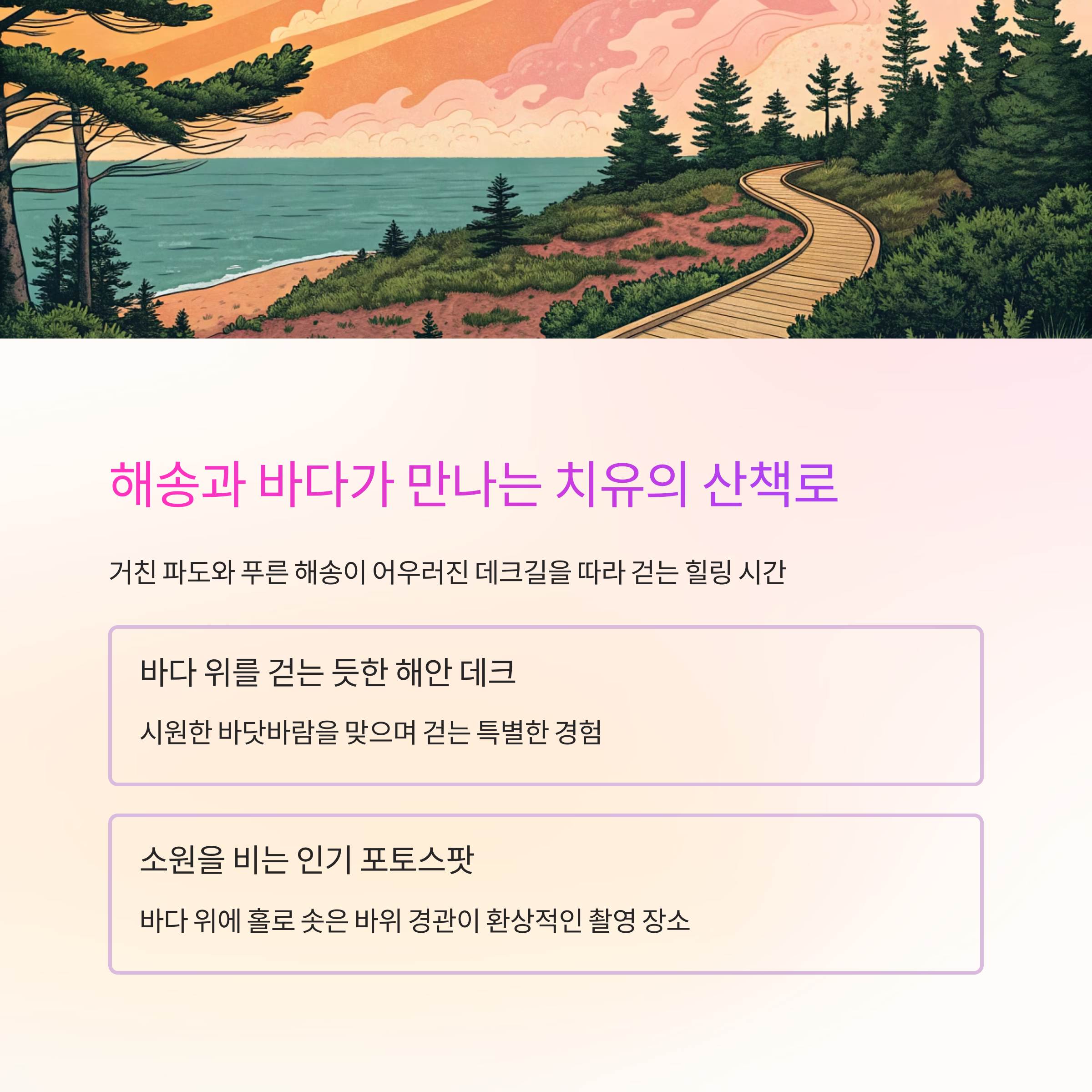 인상적입니다. 거친 파도와 해송 숲이 어우러진