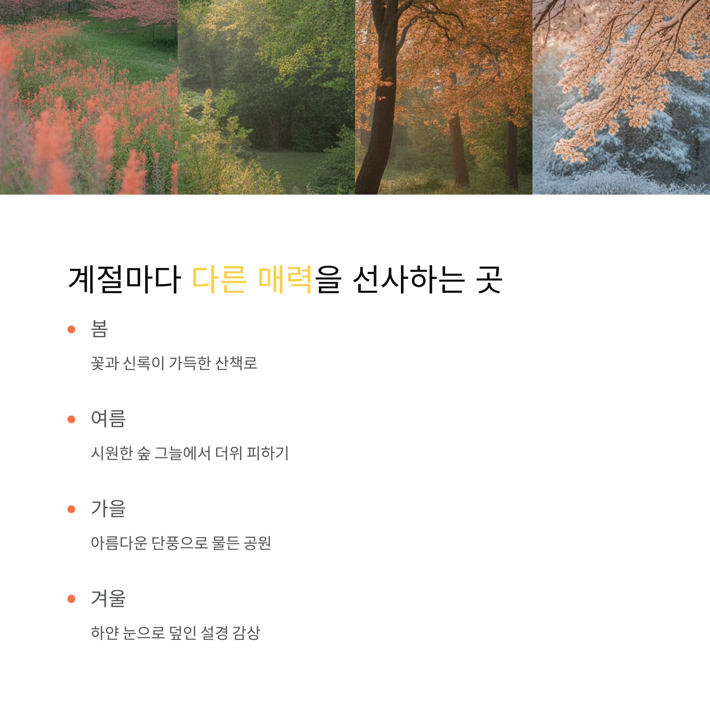 A. 봄에는 꽃과 신록, 여름에는 숲 그늘, 가을에는 단풍, 겨울에는 설경을 즐길 수 있습니다.