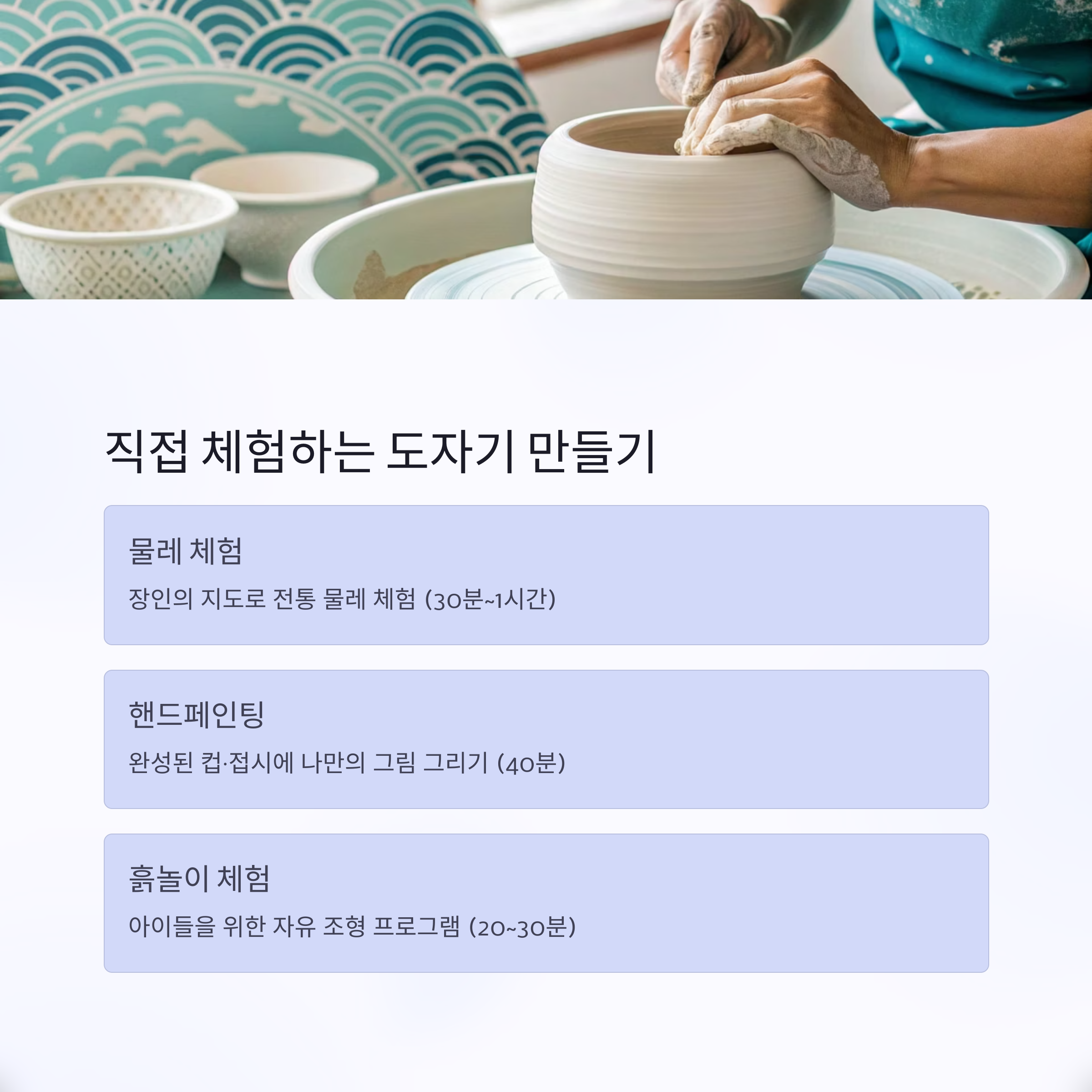 | 물레 체험 | 장인의 지도 아래 전통 물레로 도자기 빚기 | 약 30분~1시간 |