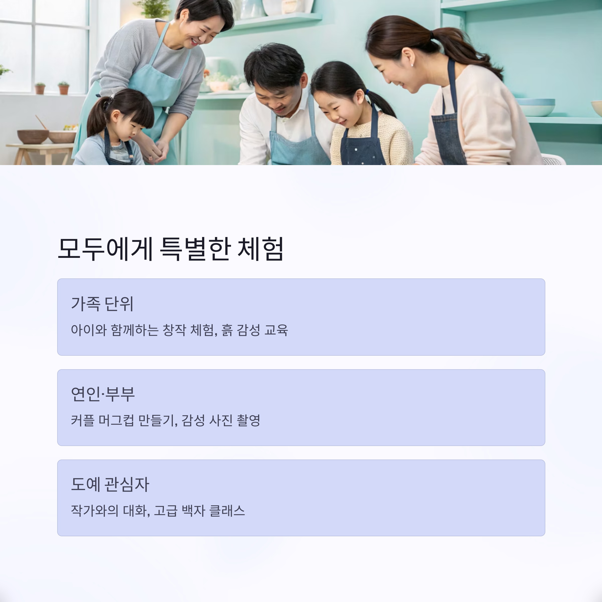 | 가족 단위 | 아이와 함께 창작 체험 가능, 흙 감성 교육 |
