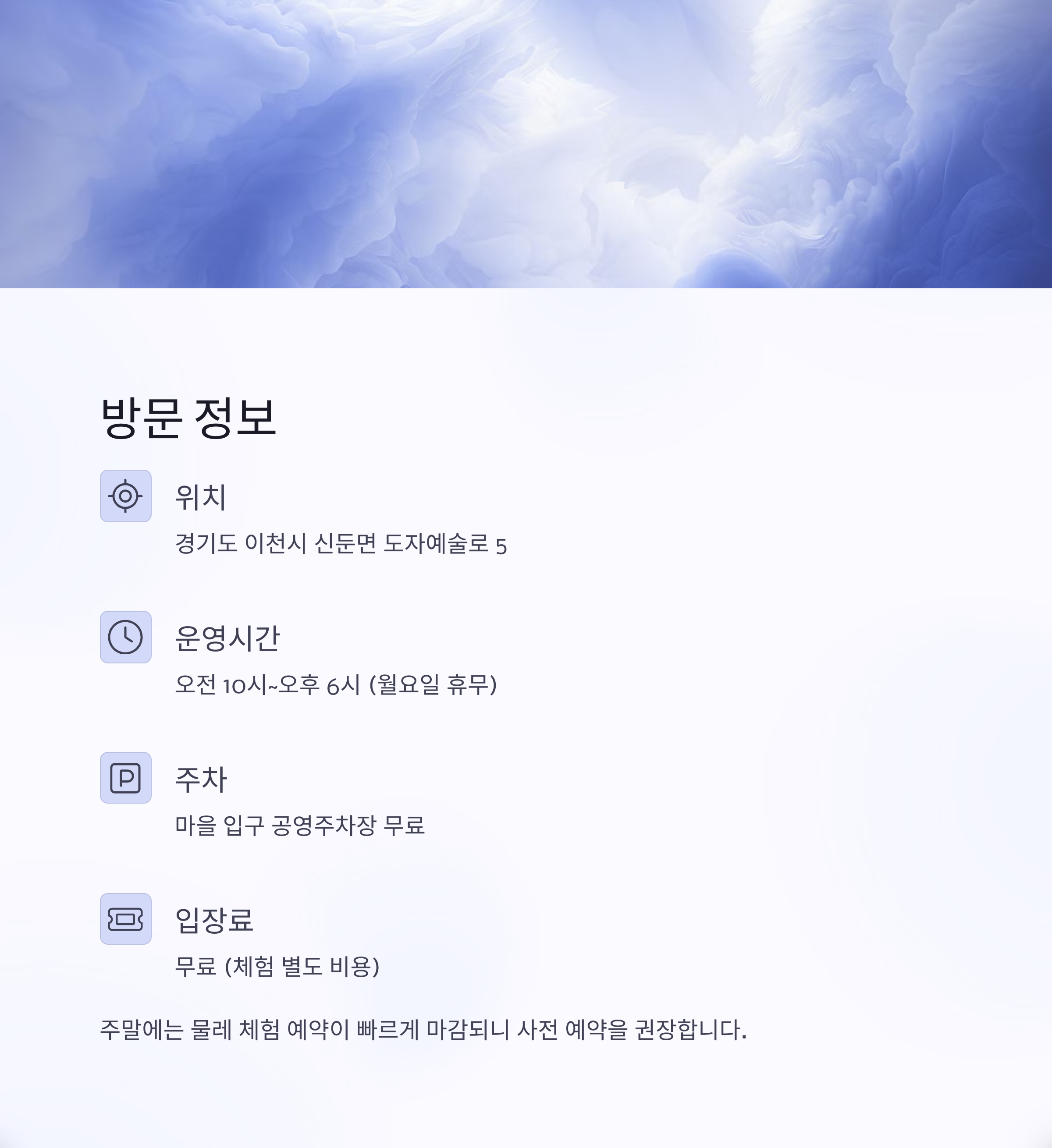 | 주차 | 마을 입구 공영주차장 무료 이용 가능 |
