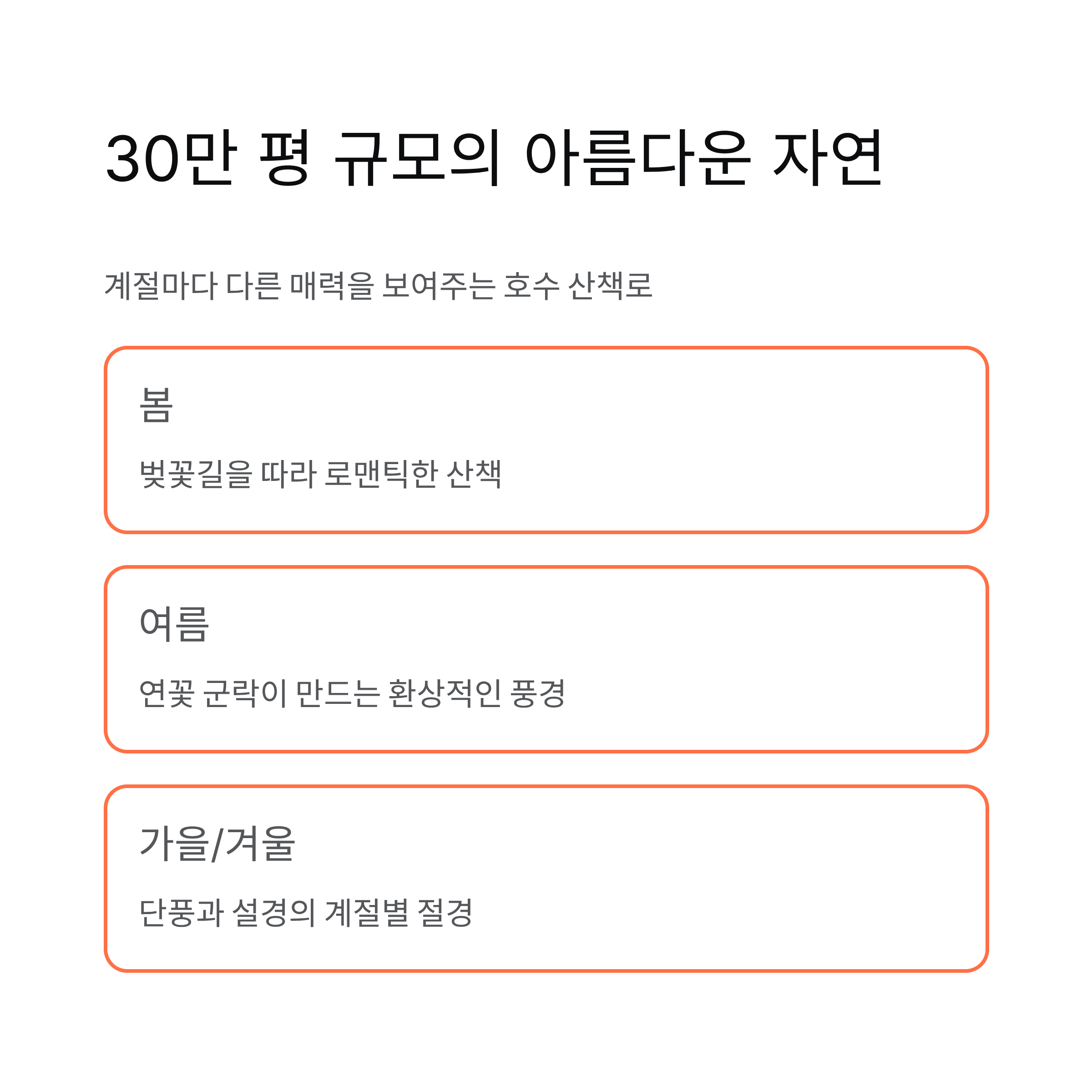 특히 봄엔 벚꽃길, 여름엔 연꽃 군락이 절경을 이룹니다.