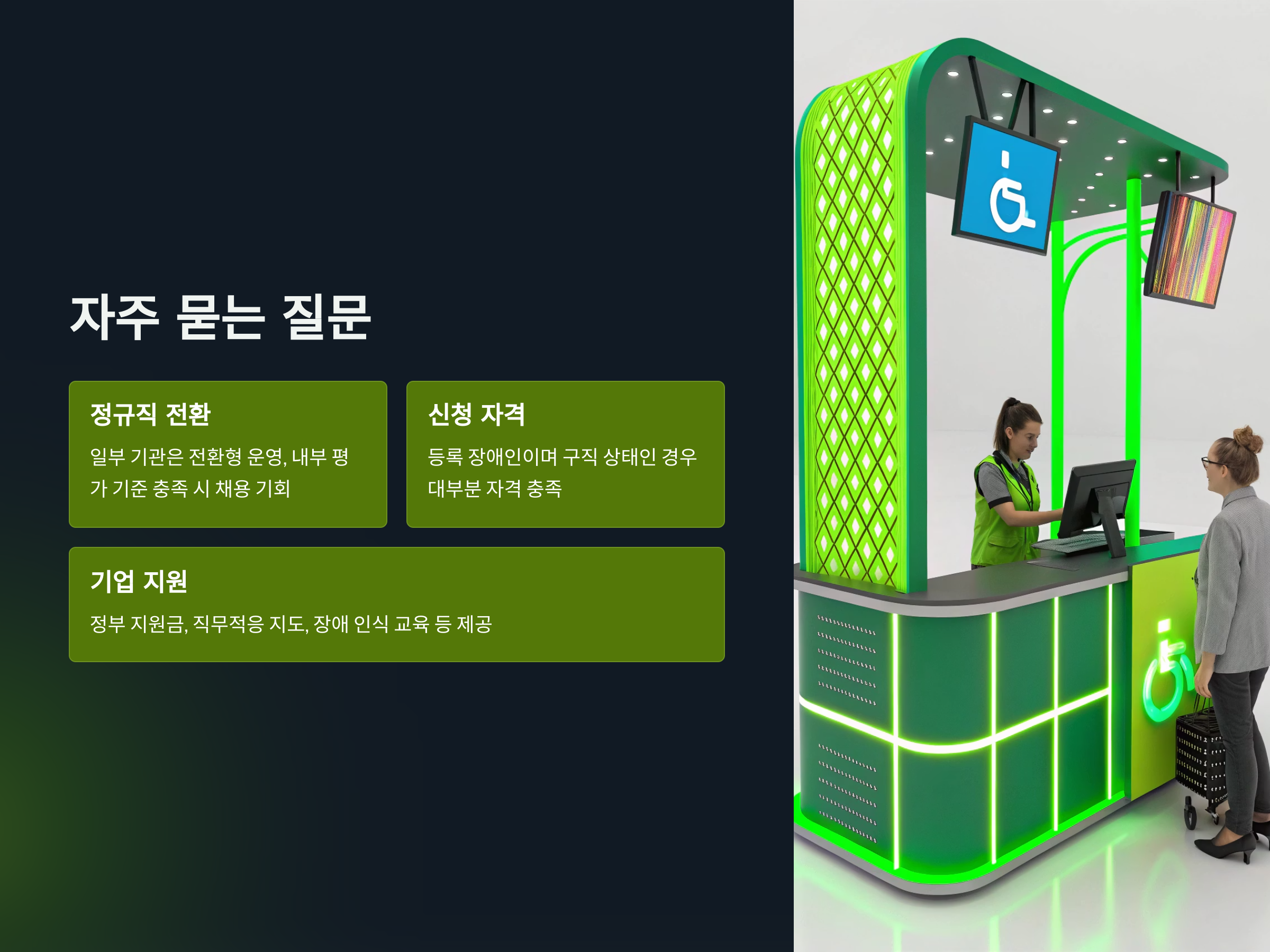 → 정부 지원금, 직무적응 지도 프로그램, 장애 인식 교육 등을 함께 제공받습니다.