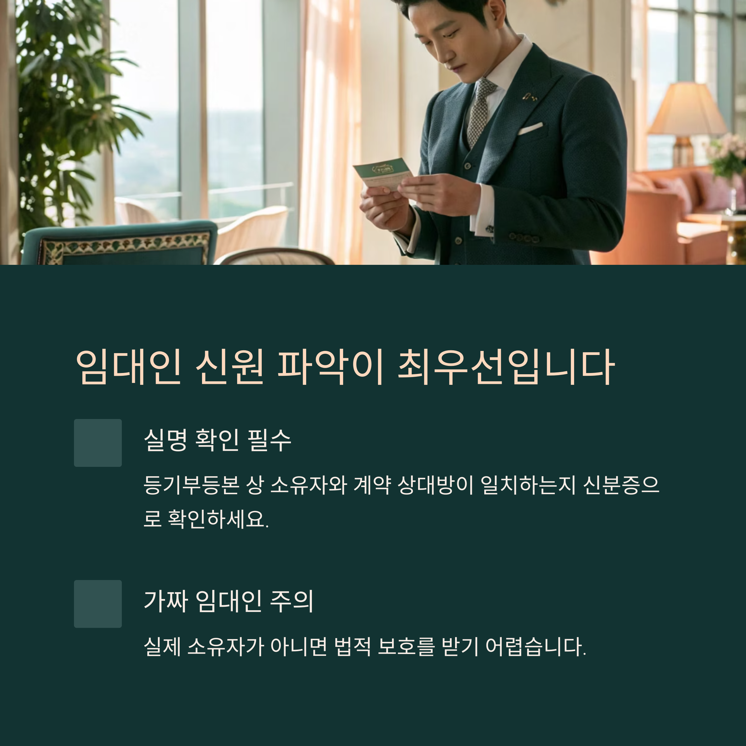 임대인의 신분, 소유권, 채무 상황을 확인해야 합니다.