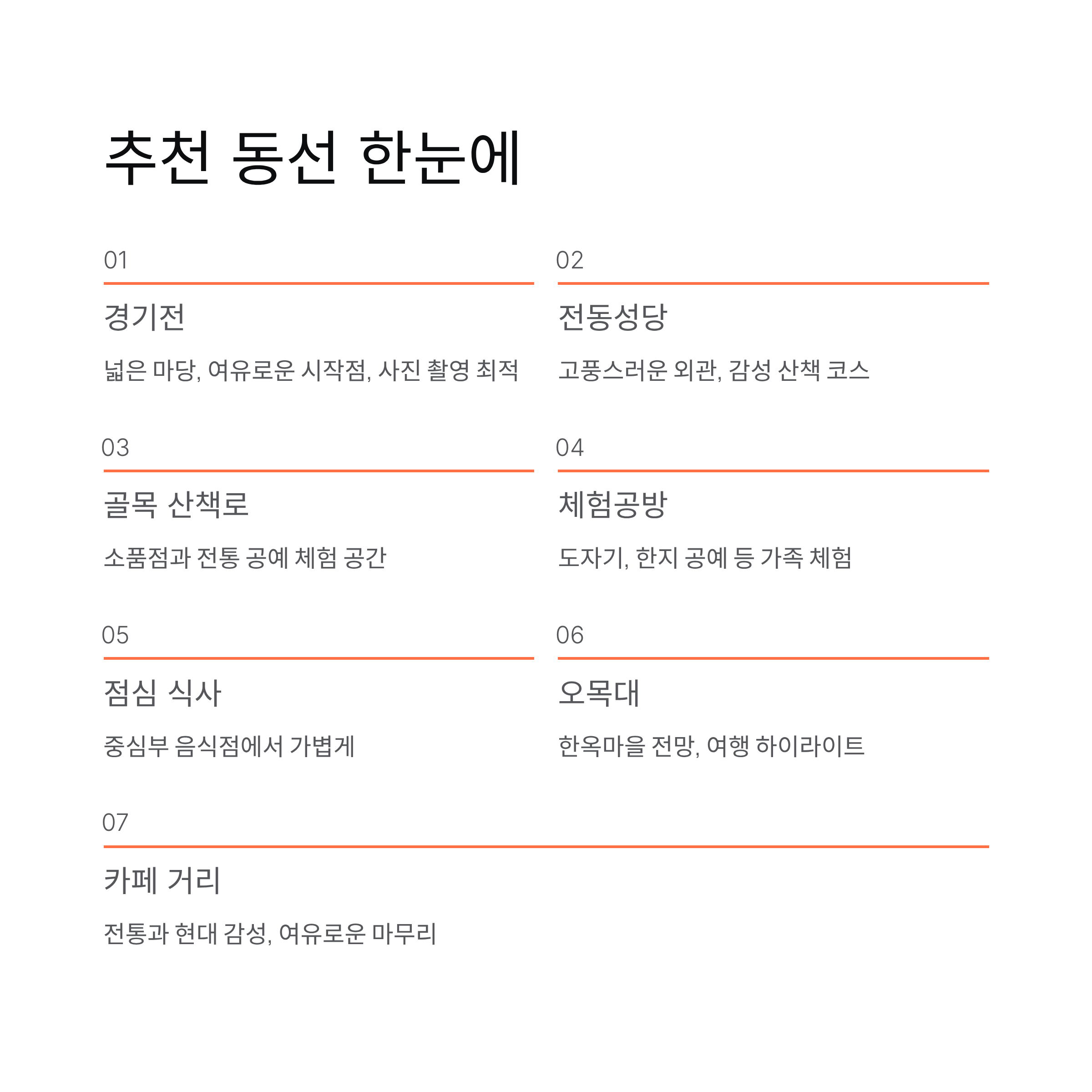 경기전, 전동성당, 골목 산책, 체험공방, 오목대 순이 자연스럽고 효율적입니다.