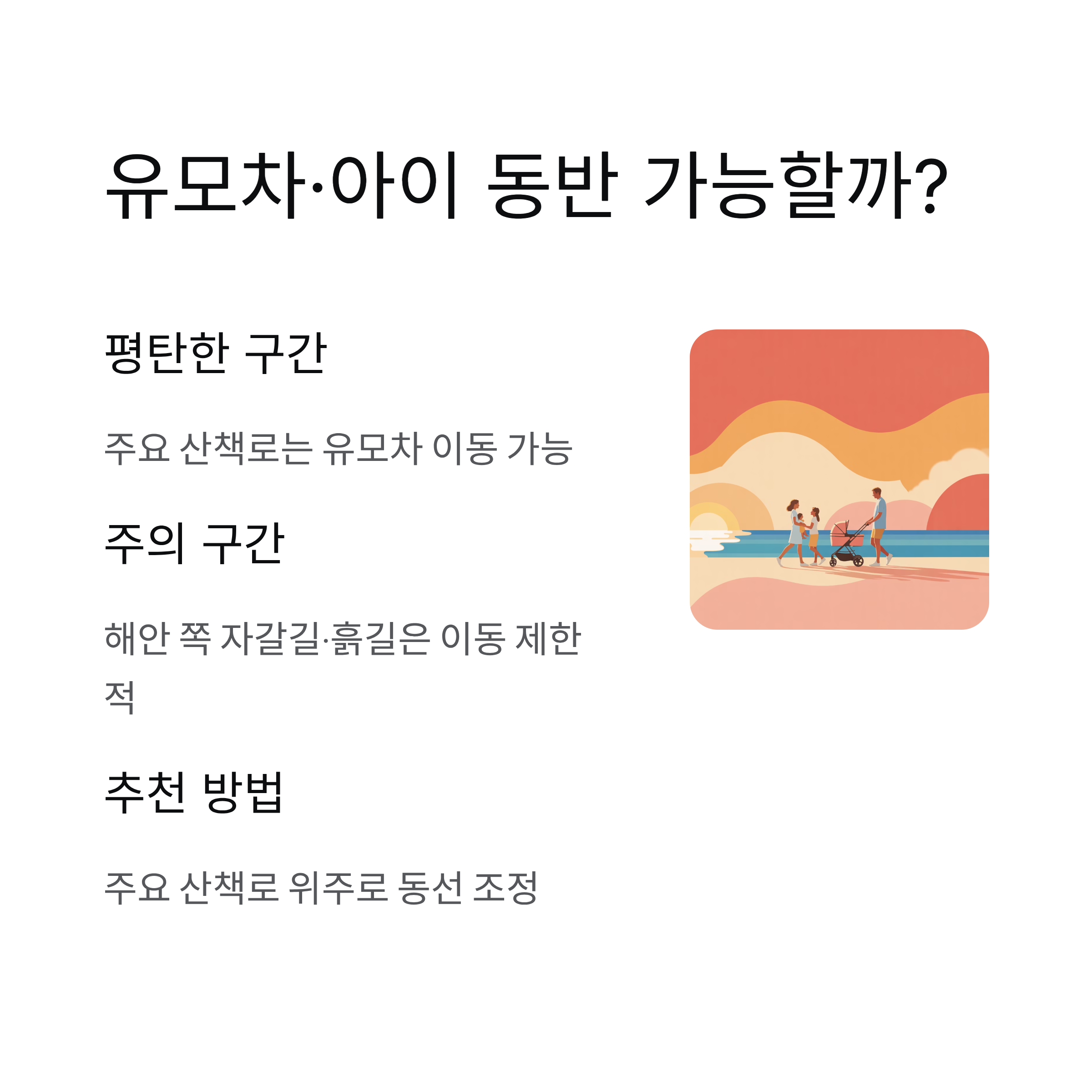 | 주차장 인근 | 평지 위주 | 유모차 이동 가능 |