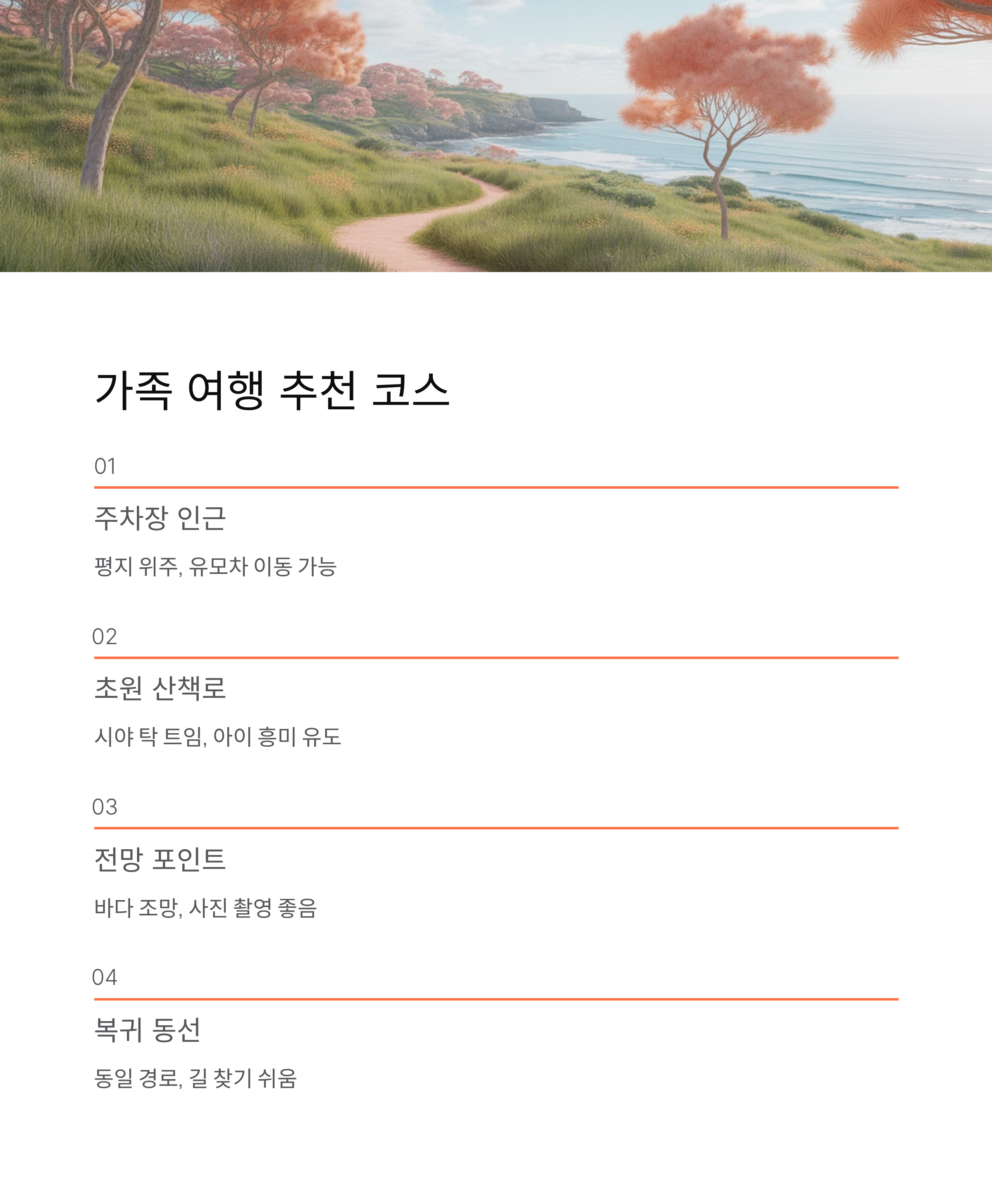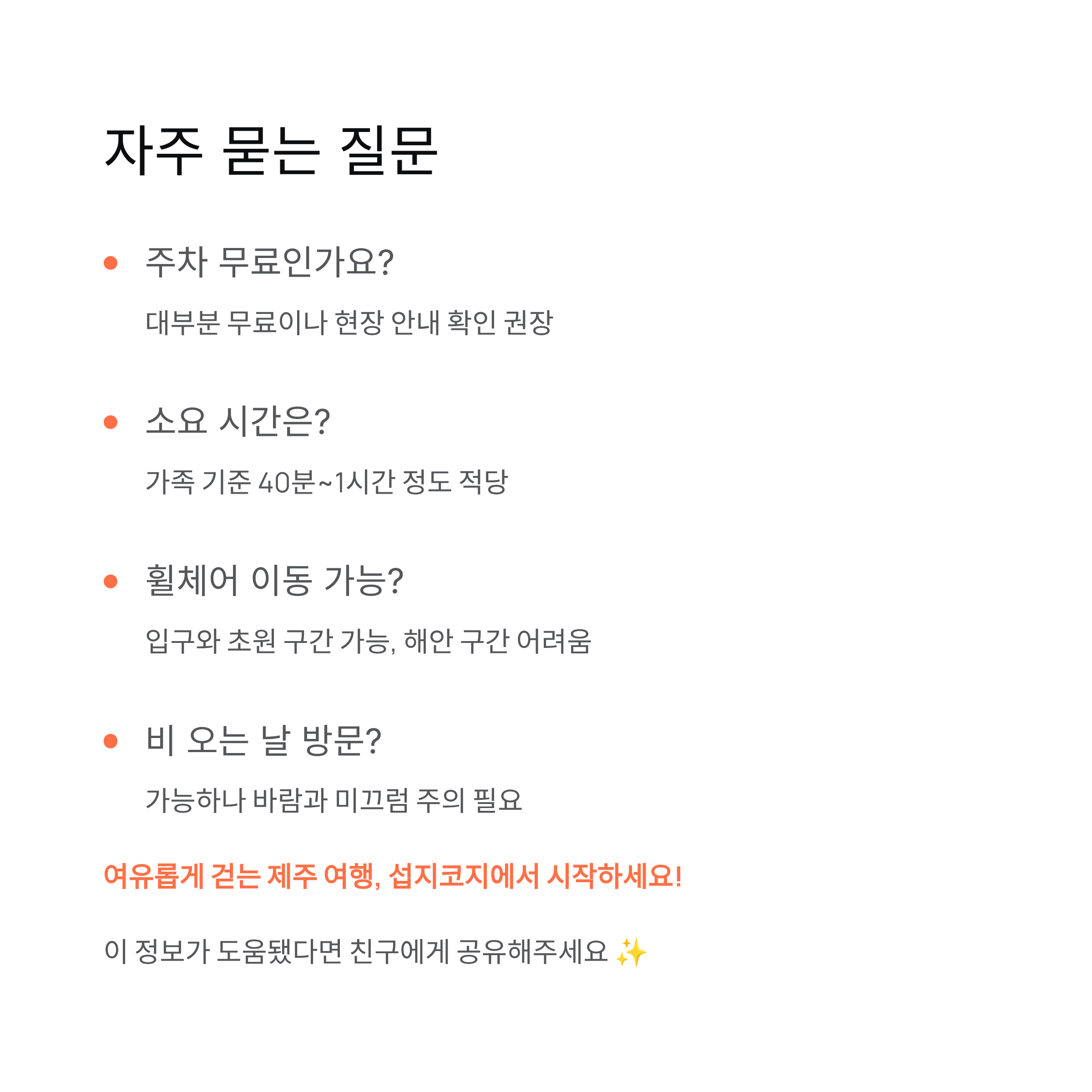 제주 섭지코지는 주차부터 동선까지 비교적 잘 정비된 여행지로, 가족 단위 여행객에게도 부담이 적은 곳입니다. 주차 위치만 미리 알고, 아이 체력에 맞춰 코스를 조절한다면 짧은 시간 안에 제주의 자연을 충분히 느낄 수 있습니다. 무리한 일정 없이 여유롭게 걷는 여행을 원한다면 섭지코지는 충분히 만족스러운 선택이 될 수 있습니다.