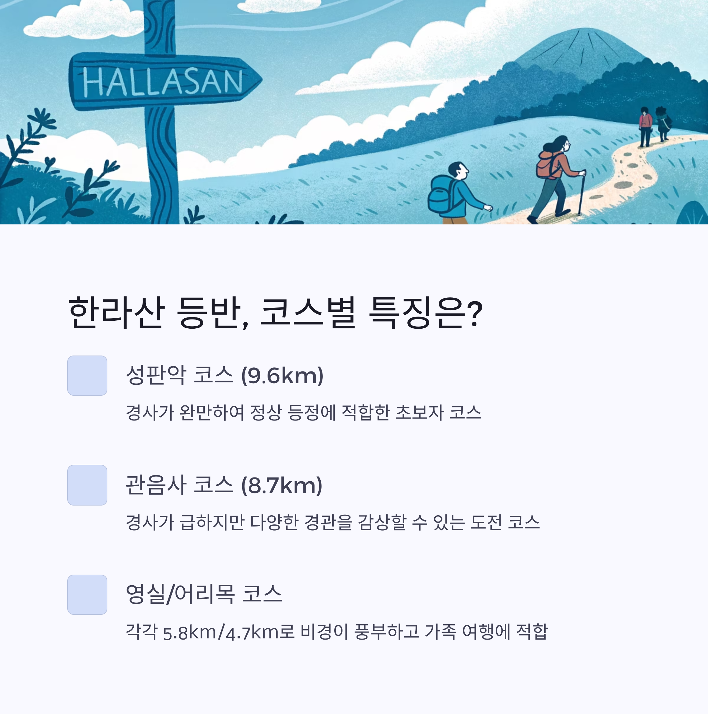 | 성판악 코스 | 약 9.6km (편도) | 경사 완만, 정상 등정 가능 |