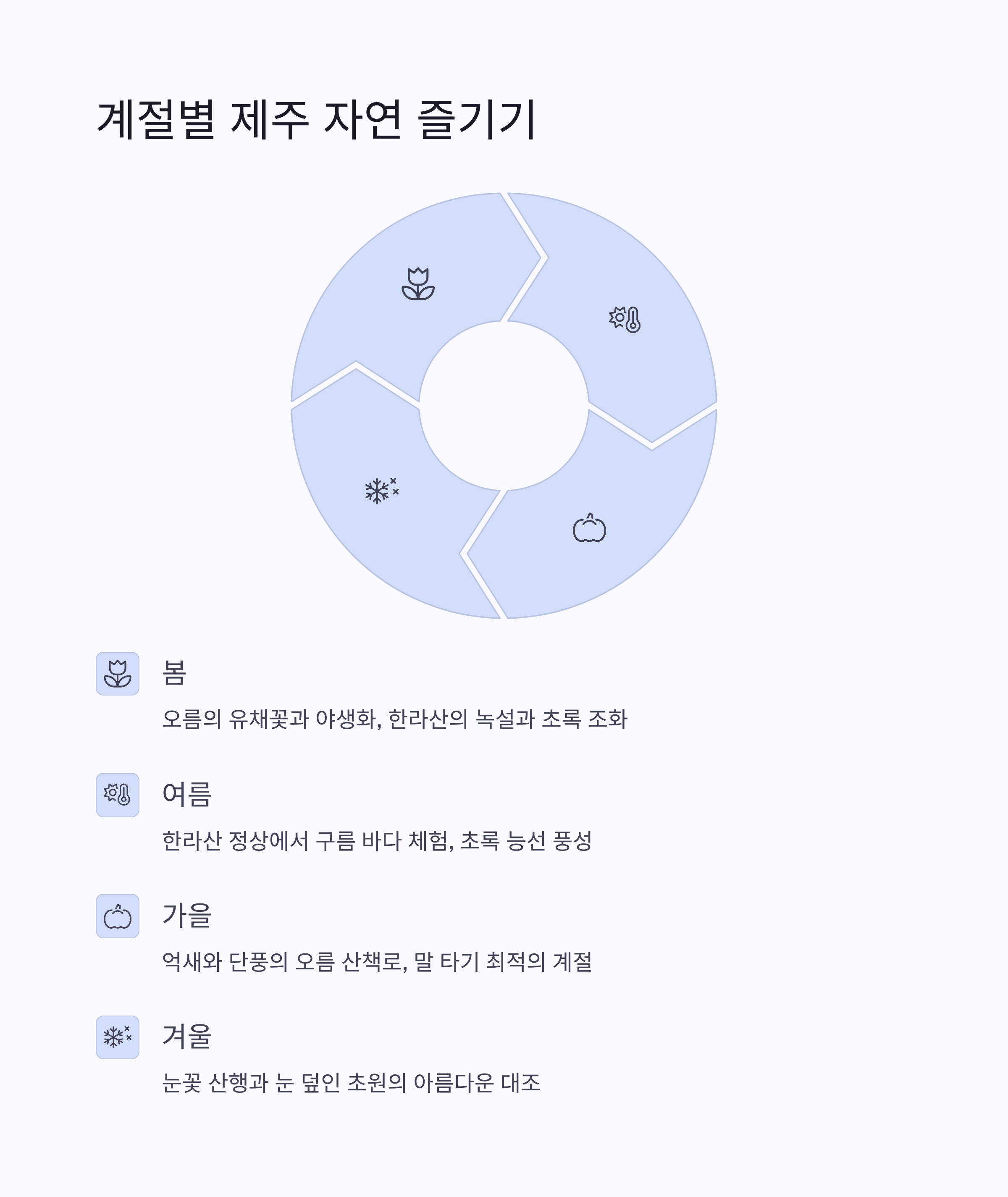 | 여름 | 한라산 정상에서 구름 바다 체험, 오름의 초록 능선 풍성 |