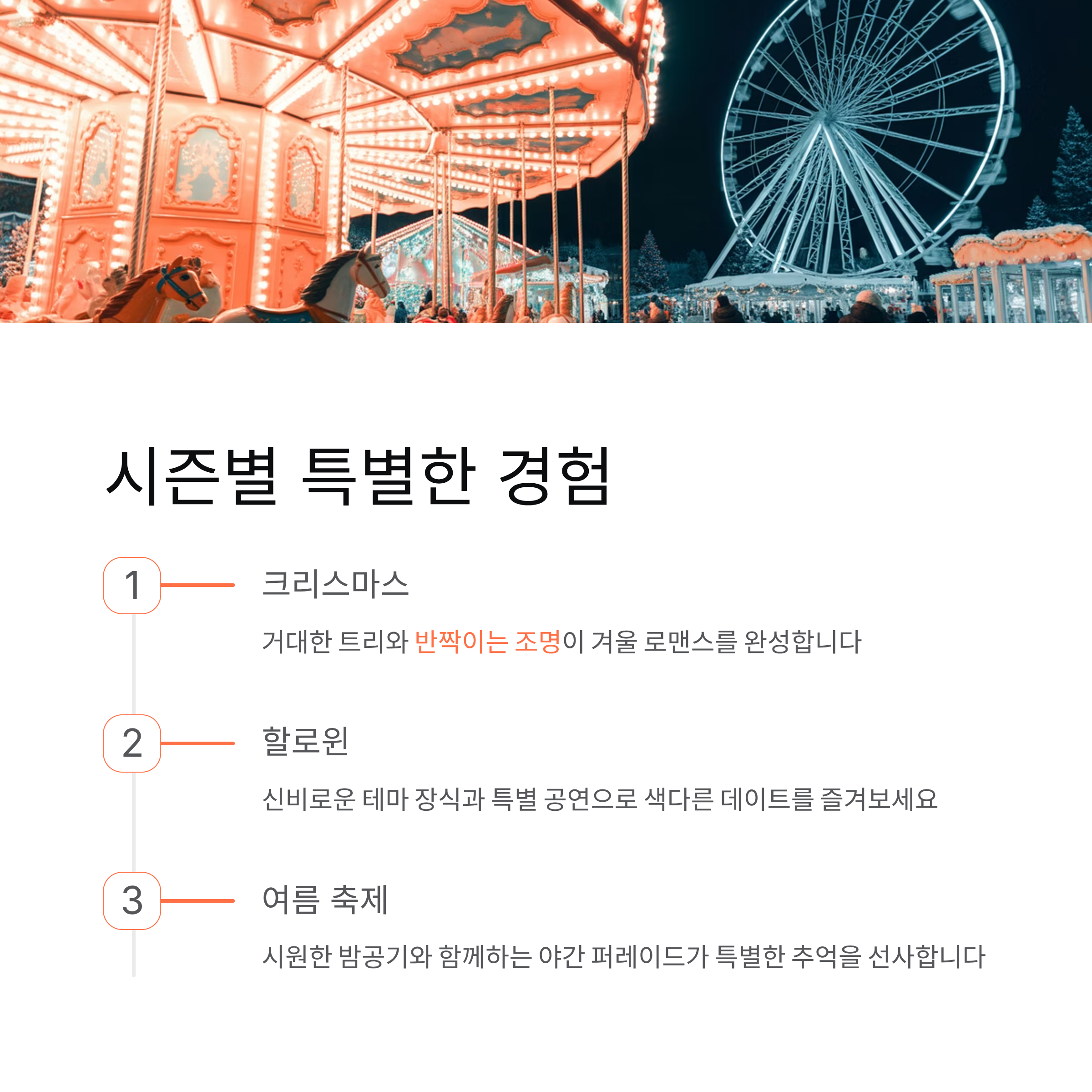 화려한 불빛, 아기자기한 테마존, 밤하늘을 수놓는 불꽃놀이까지 커플에게는 특별한 배경이 되어주지요.