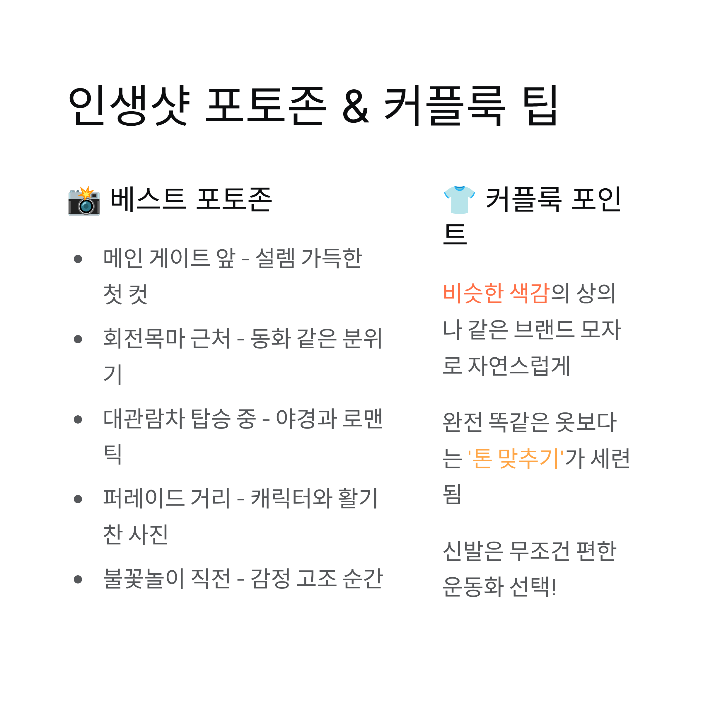 | 패션 | 커플티, 모자, 편한 운동화 | 사진과 편안함 모두 챙기기 |