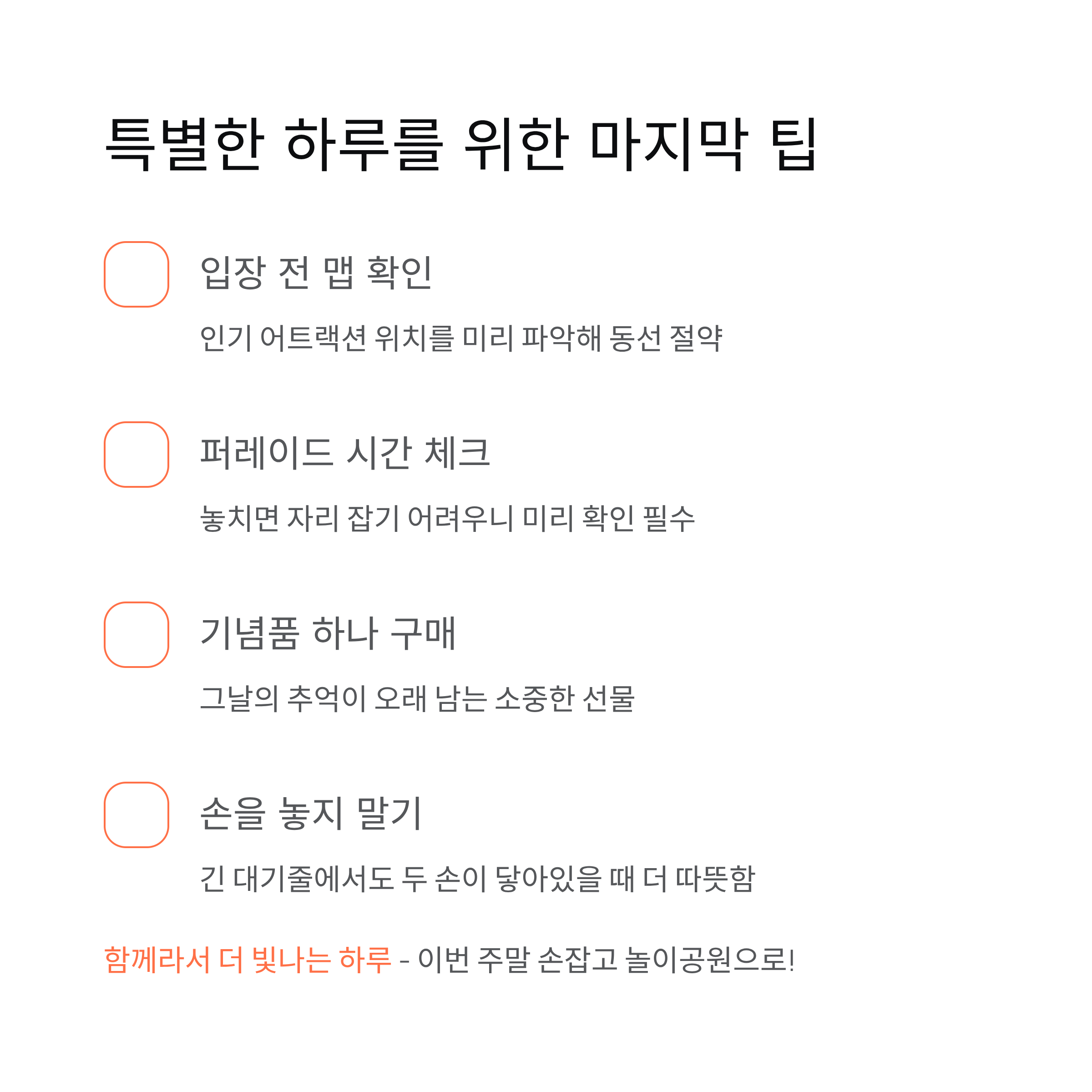 - 입장 전 미리 맵 확인하기 : 인기 어트랙션 위치를 알아두면 동선이 절약돼요.