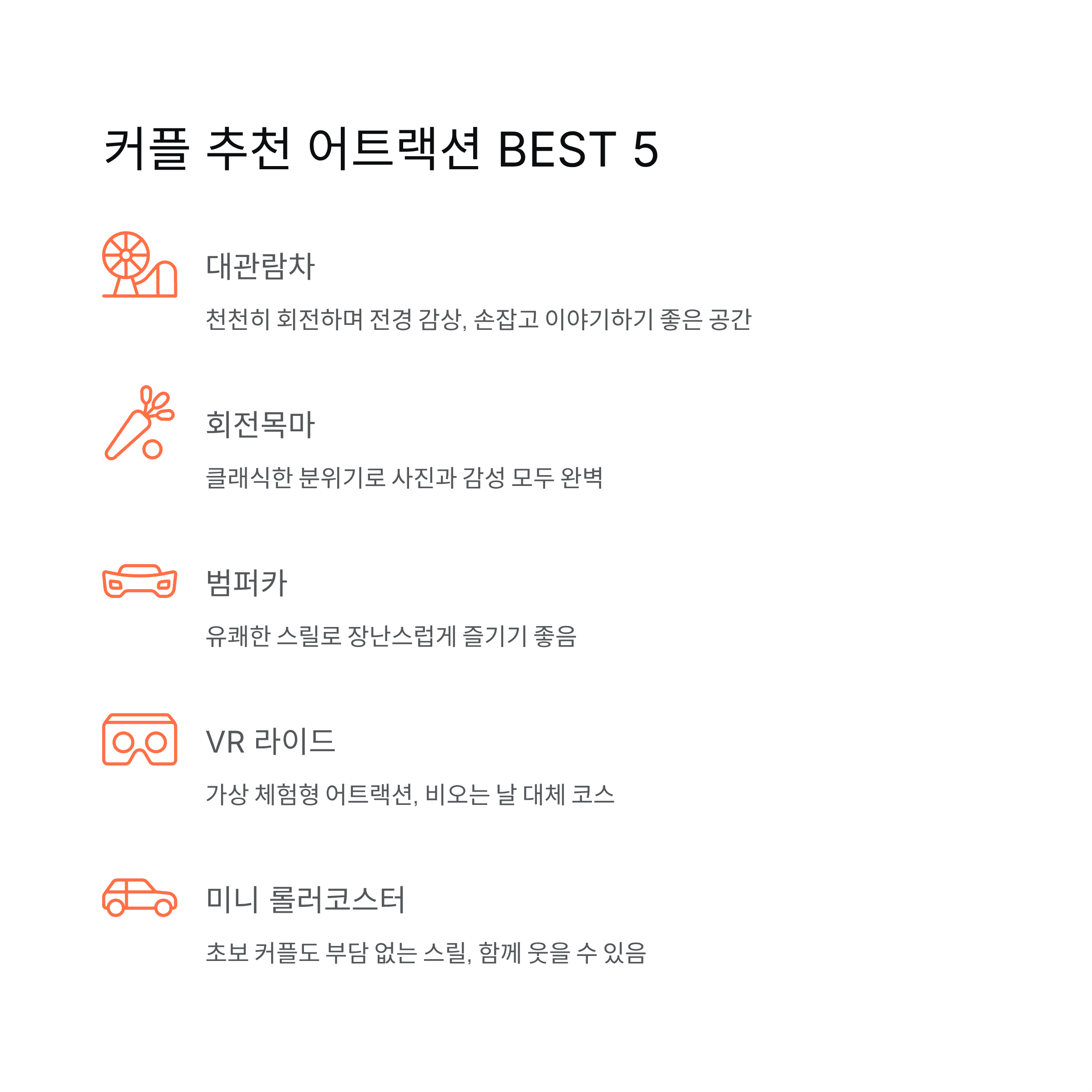 | 미니 롤러코스터 | 초보 커플도 부담 없는 스릴 | 함께 웃을 수 있는 타이밍 많음 |