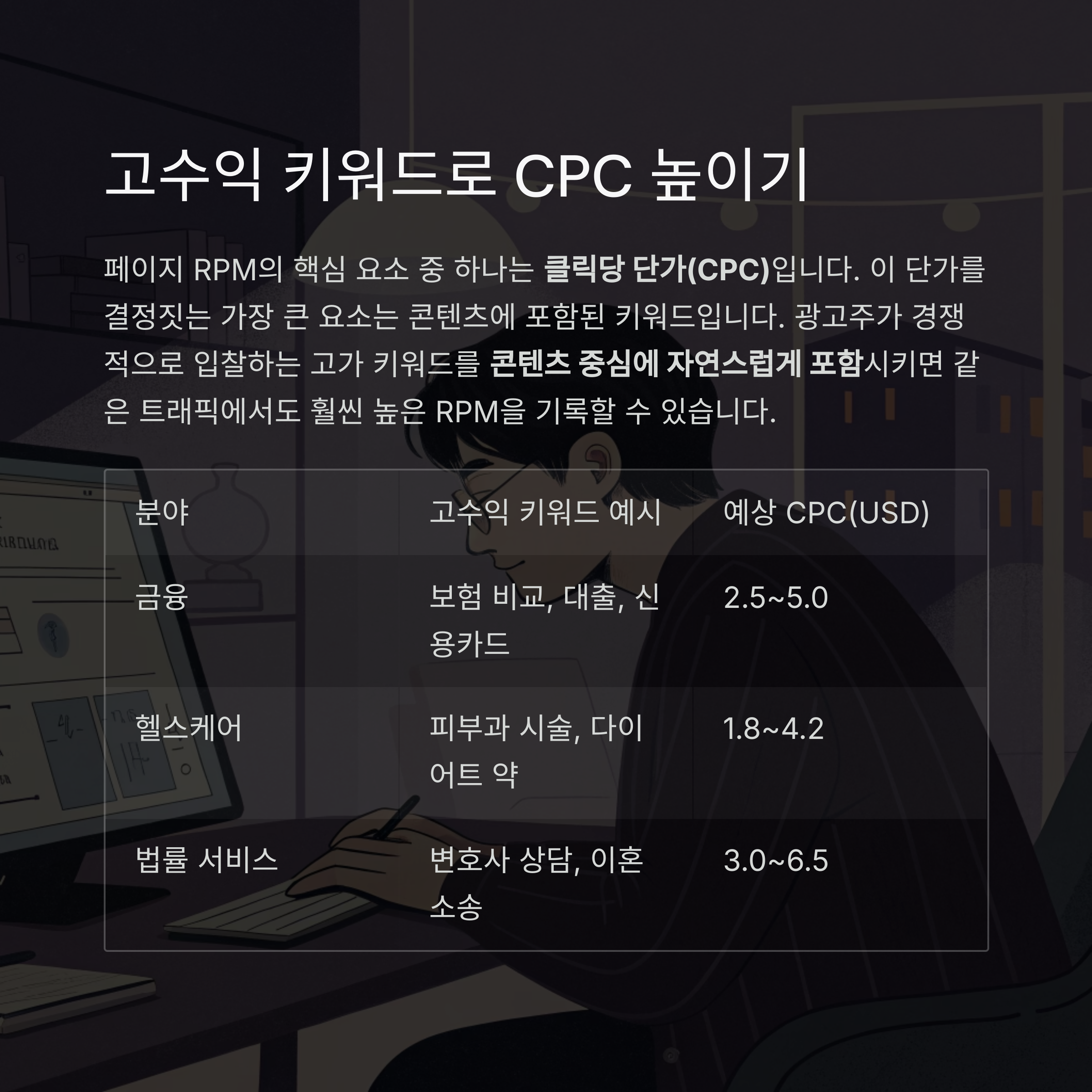 광고주가 경쟁적으로 입찰하는 고가 키워드를 콘텐츠 중심에 자연스럽게 포함시키면