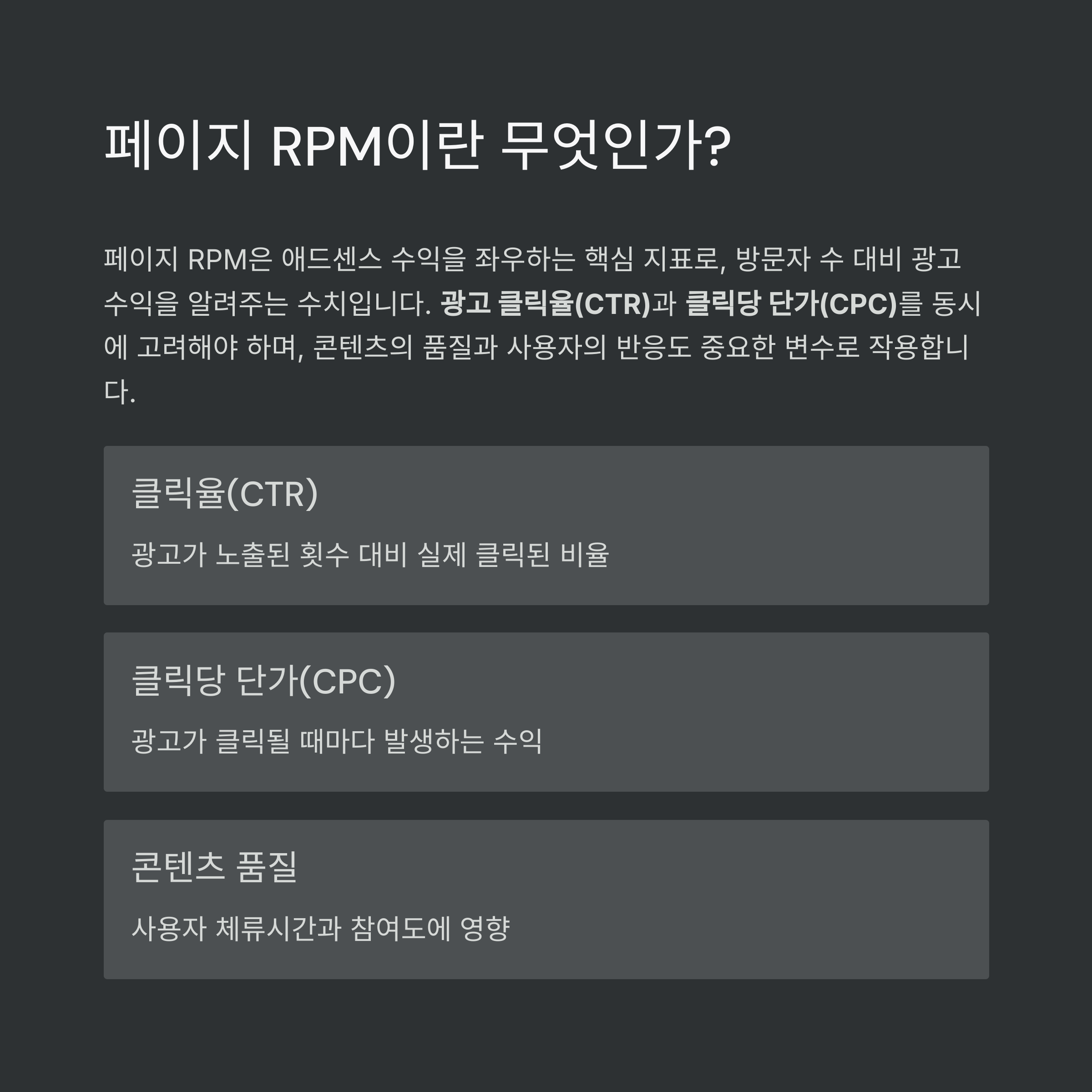 페이지 RPM은 애드센스 수익을 좌우하는 핵심 지표로, 방문자 수 대비 광고 수익을 알려주는 수치입니다.