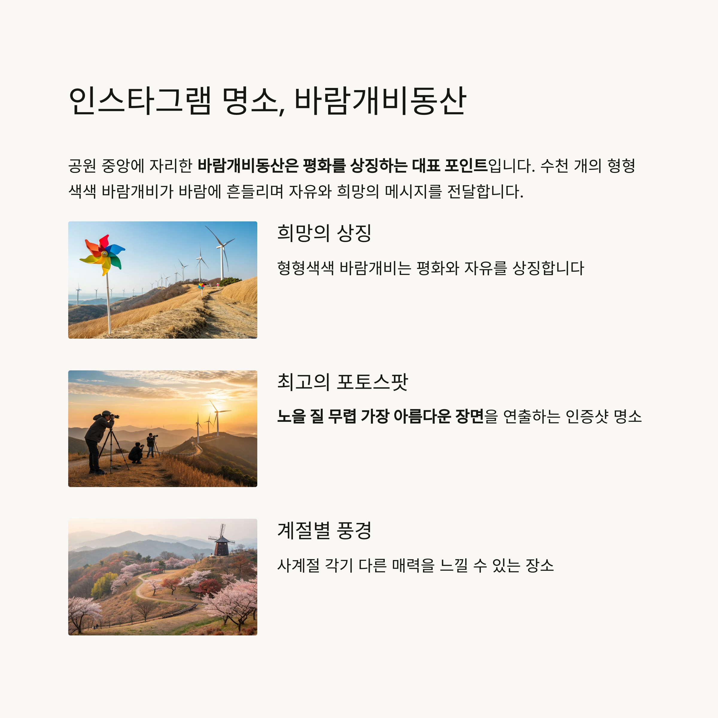 공원 중앙에 자리한 바람개비동산은 평화를 상징하는 대표 포인트입니다.