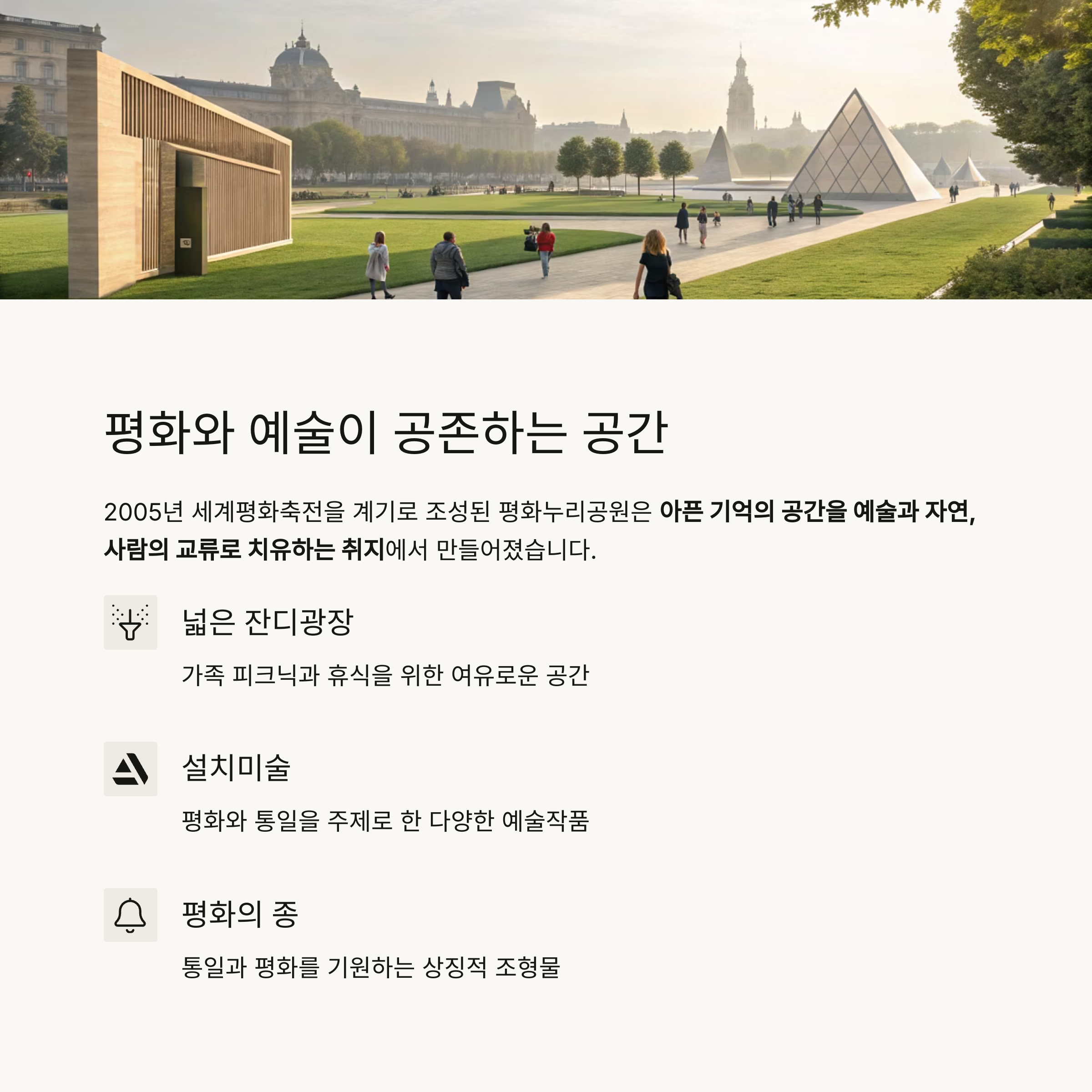 넓은 잔디광장과 설치미술, 바람개비동산, 평화의 종 등이 방문객을 맞이합니다.