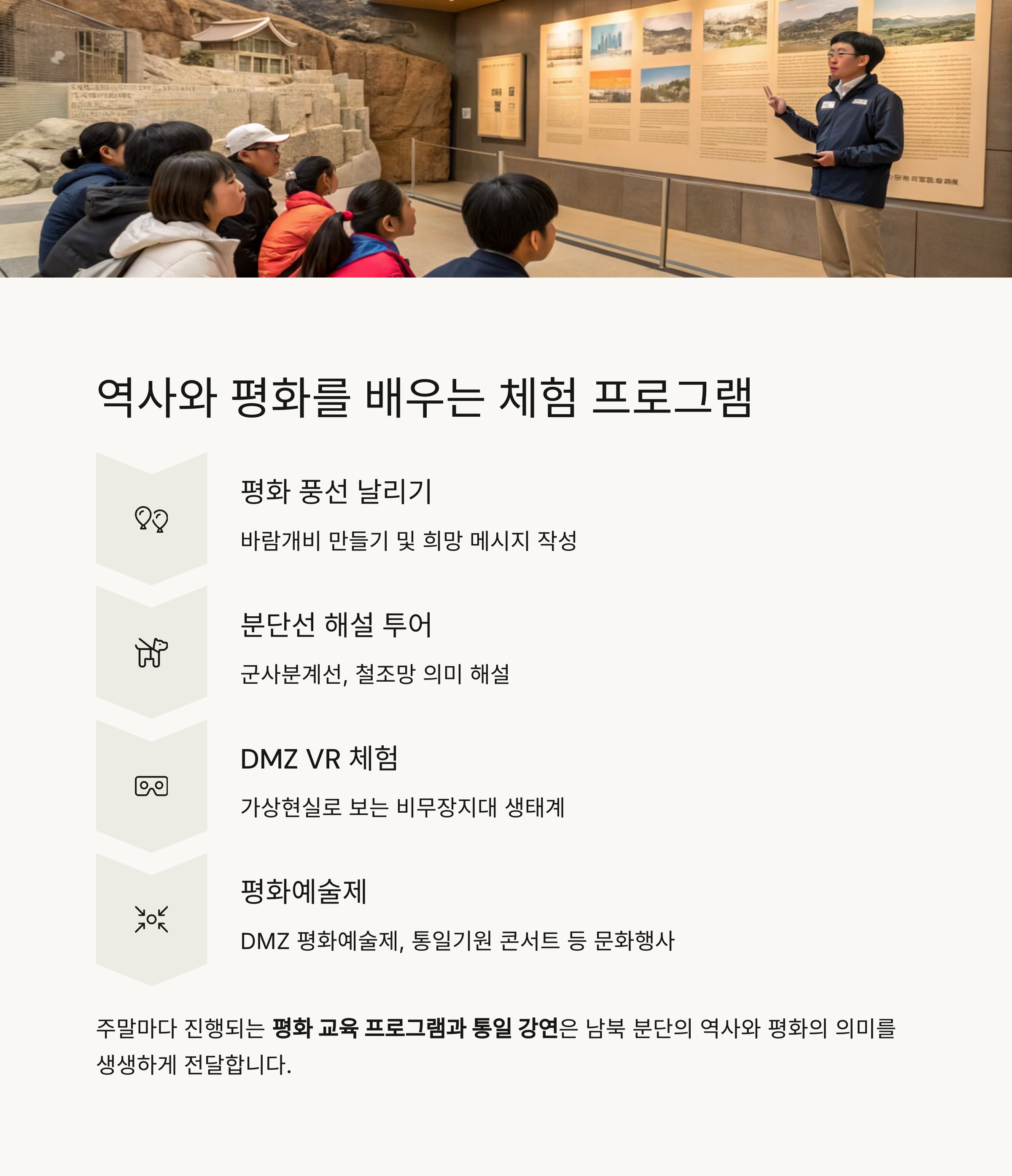 공원 내에서는 주말마다 평화 교육 프로그램, 통일 강연, DMZ 투어 연계 체험 등이 열립니다.