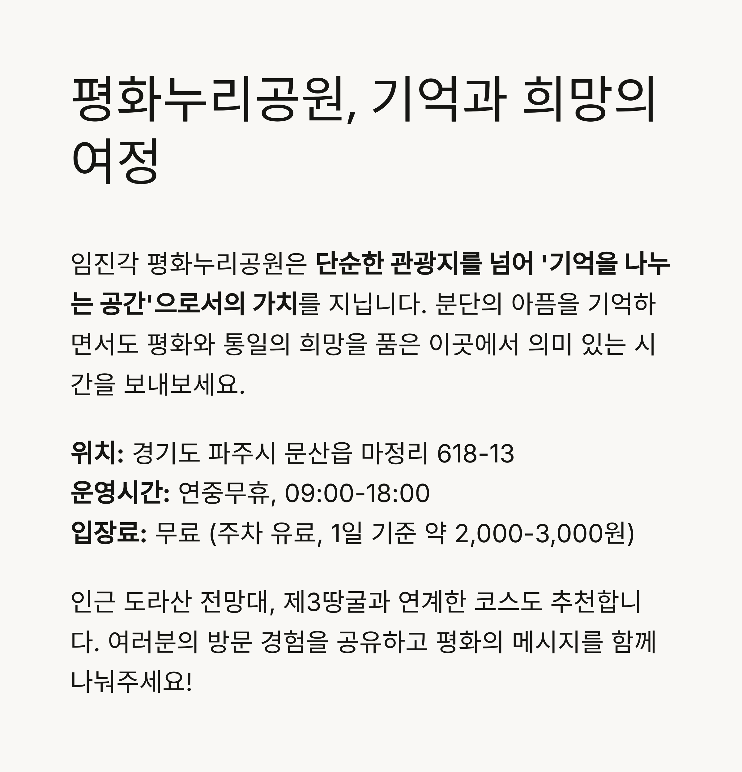 남북 분단의 아픔을 기억하면서도 평화와 통일의 메시지를 전하는 상징적 장소입니다.