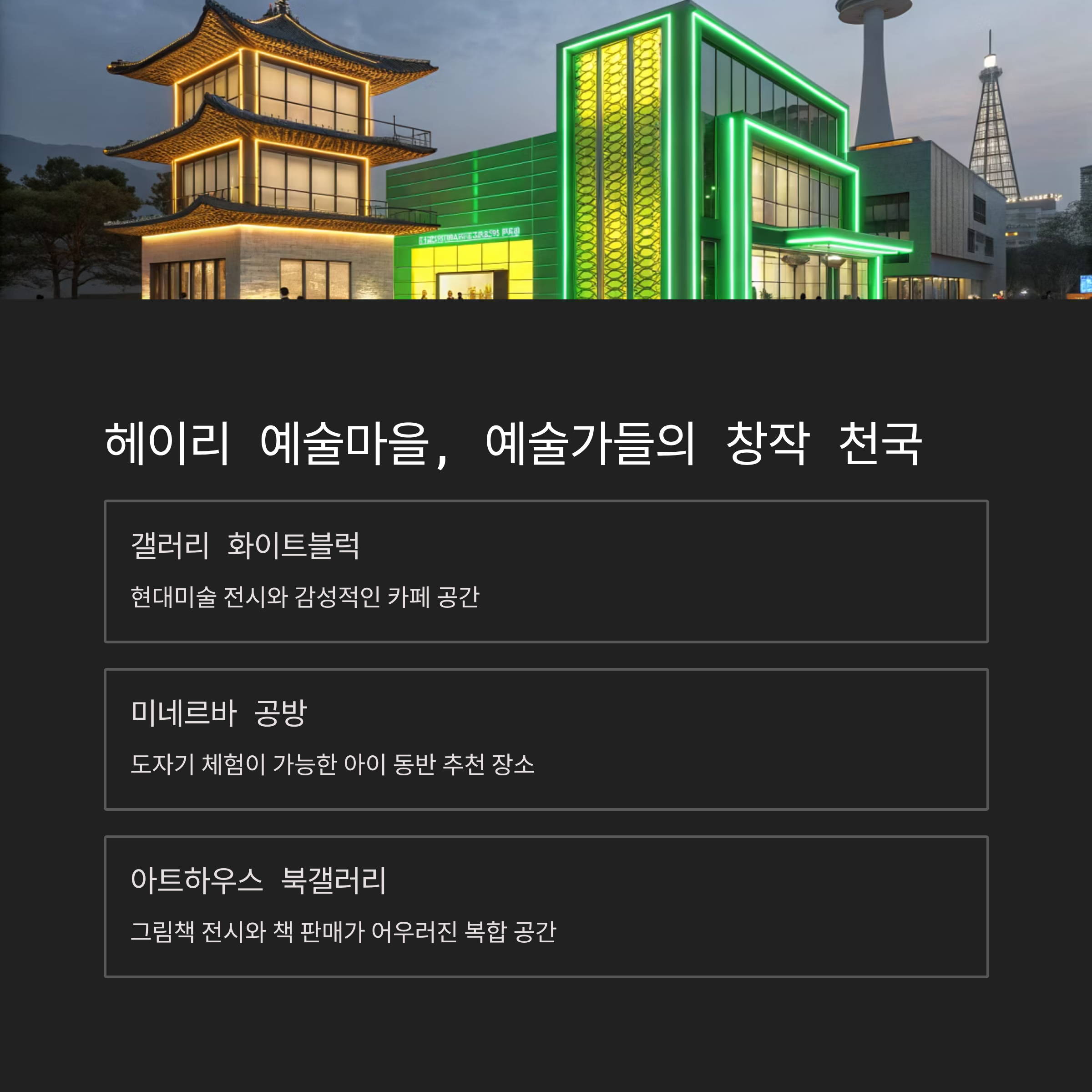 | 오전 10시 | 헤이리 예술마을 산책, 공방 체험 |