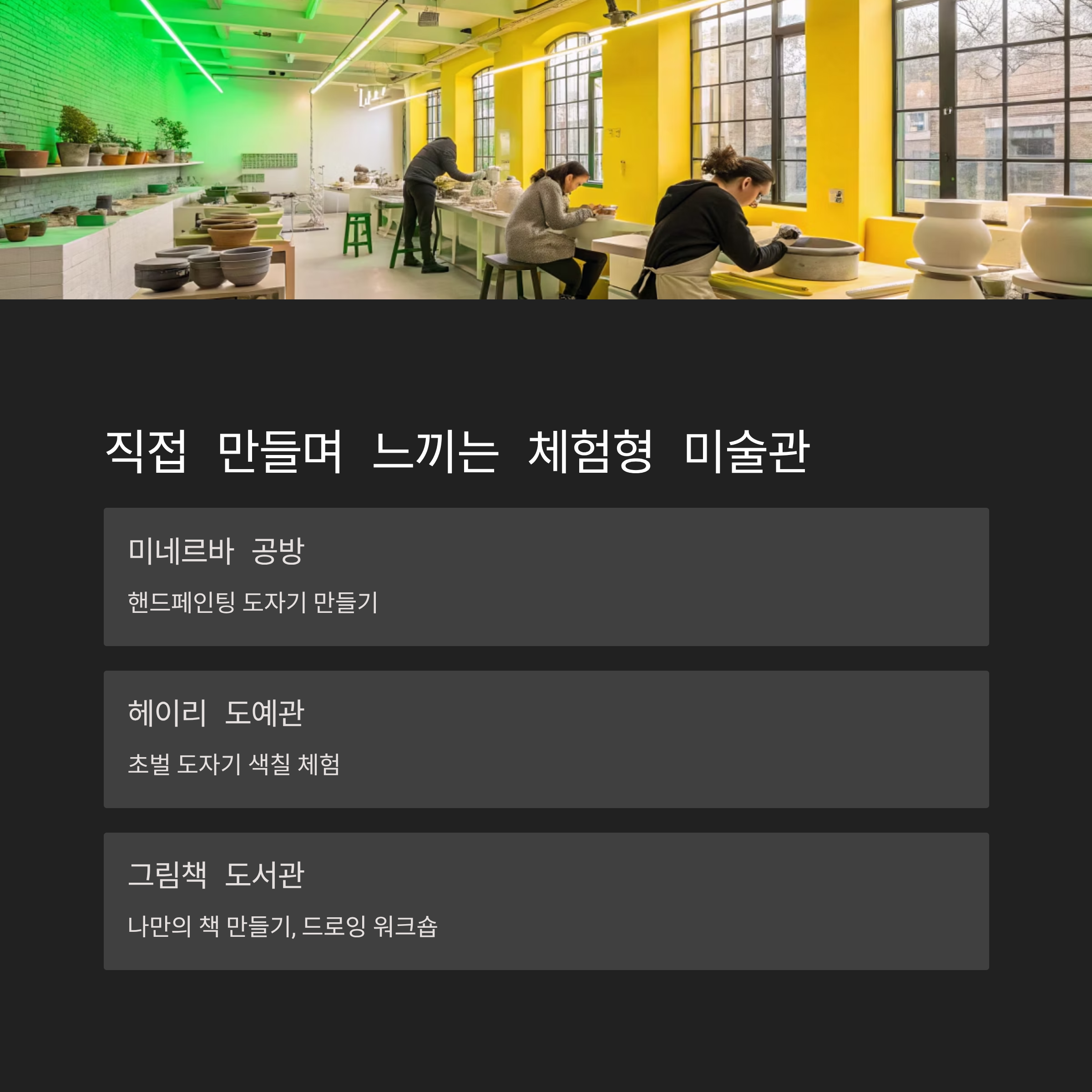 | 미네르바 공방 | 도자기 체험 가능, 아이 동반 추천 |