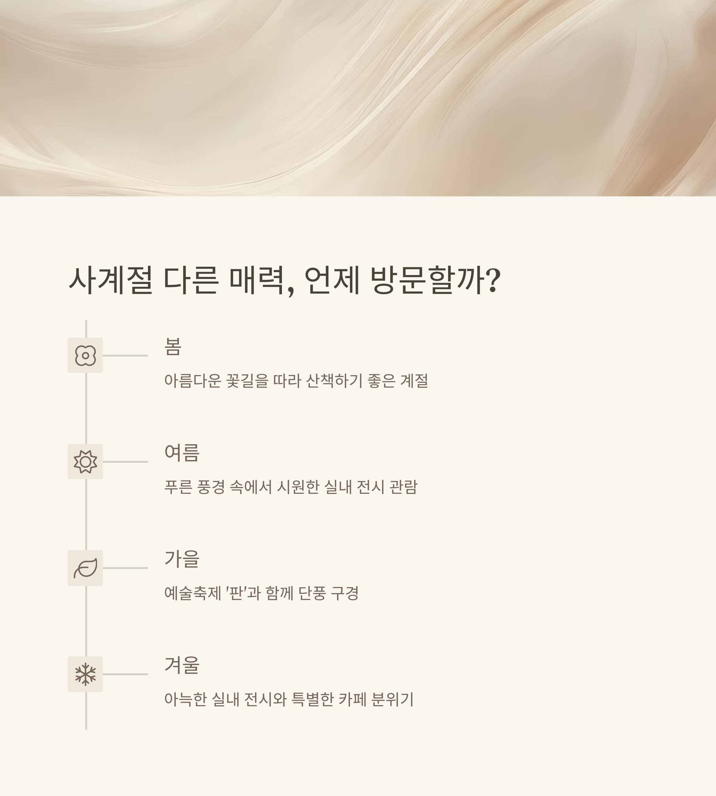 특히 가을은 선선한 날씨 덕분에 야외 활동과 갤러리 투어를 함께 즐기기에 최적입니다.