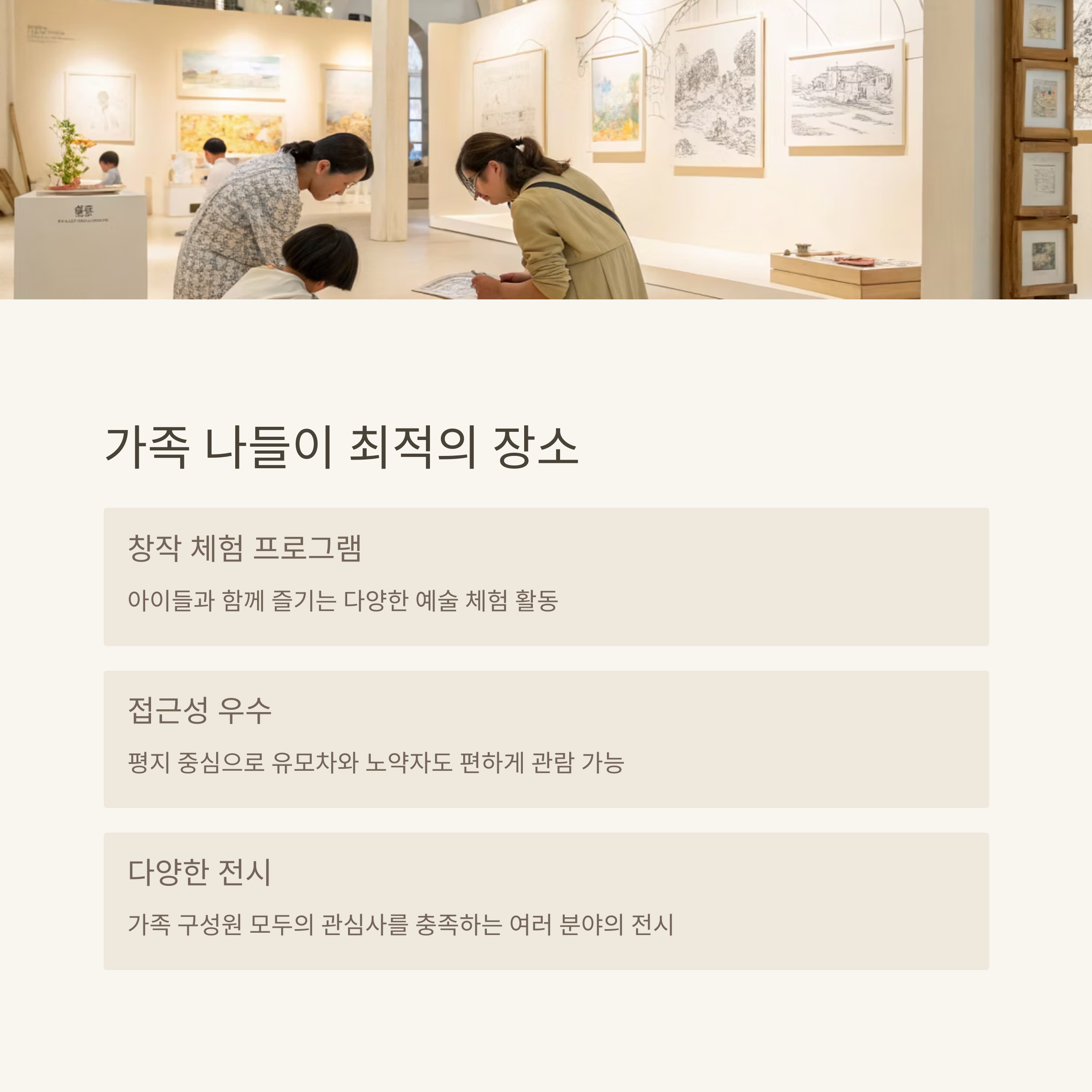 아이들과 함께하는 미술 체험 교실, 동화책 박물관, 자연 속 산책로가 잘 조성되어 있습니다.