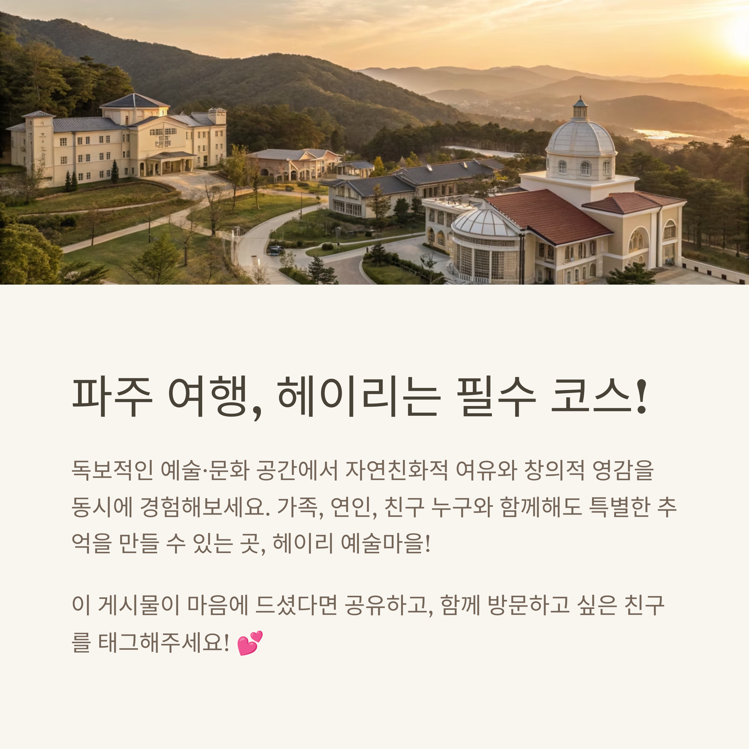 서울 근교 파주에 위치해 있으며, 회화, 조각, 문학, 음악, 건축이 어우러진 독특한 마을입니다.