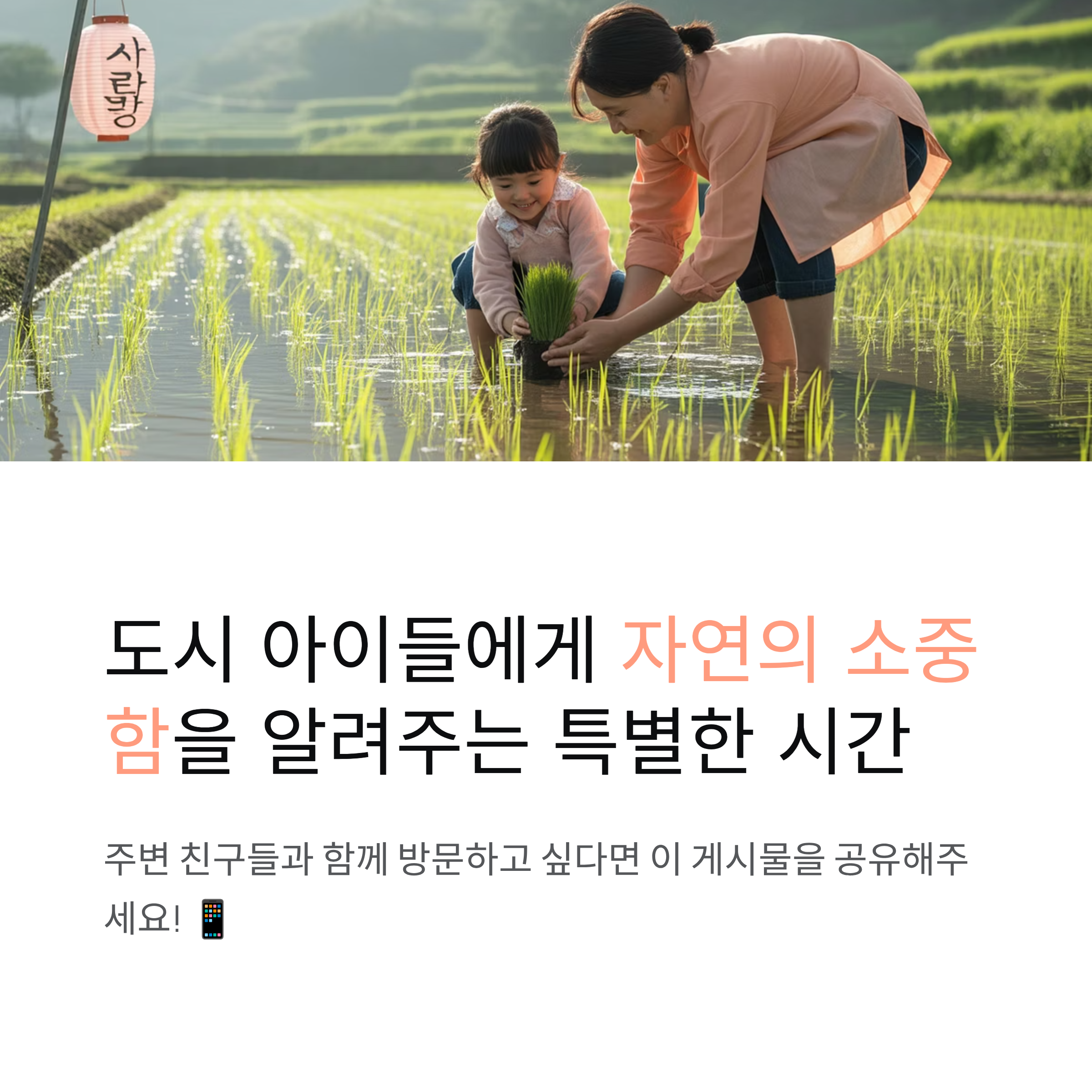농업생태원에서는 모내기 체험, 수확 체험, 곡물 가공 체험 등 아이들이 손으로 직접 해볼 수 있는 다양한 프로그램이 준비되어 있습니다. 이를 통해 도시 아이들도 농업의 가치를 쉽게 이해할 수 있습니다.