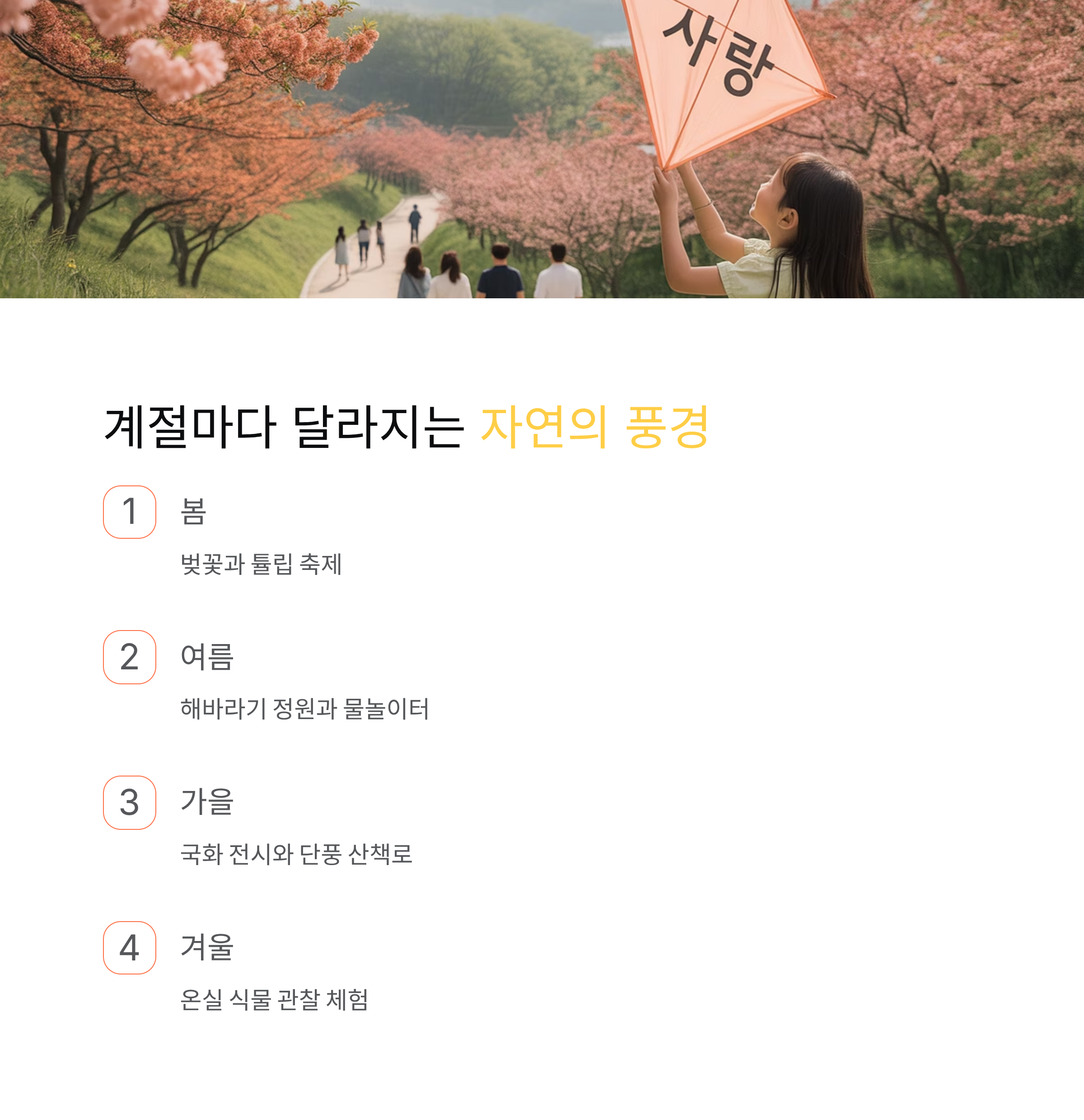 봄에는 벚꽃과 튤립, 여름에는 해바라기, 가을에는 국화와 단풍, 겨울에는 온실 식물 전시가 이어집니다. 방문 시기에 따라 다른 풍경을 볼 수 있어 사계절 내내 새로운 즐거움이 있습니다.