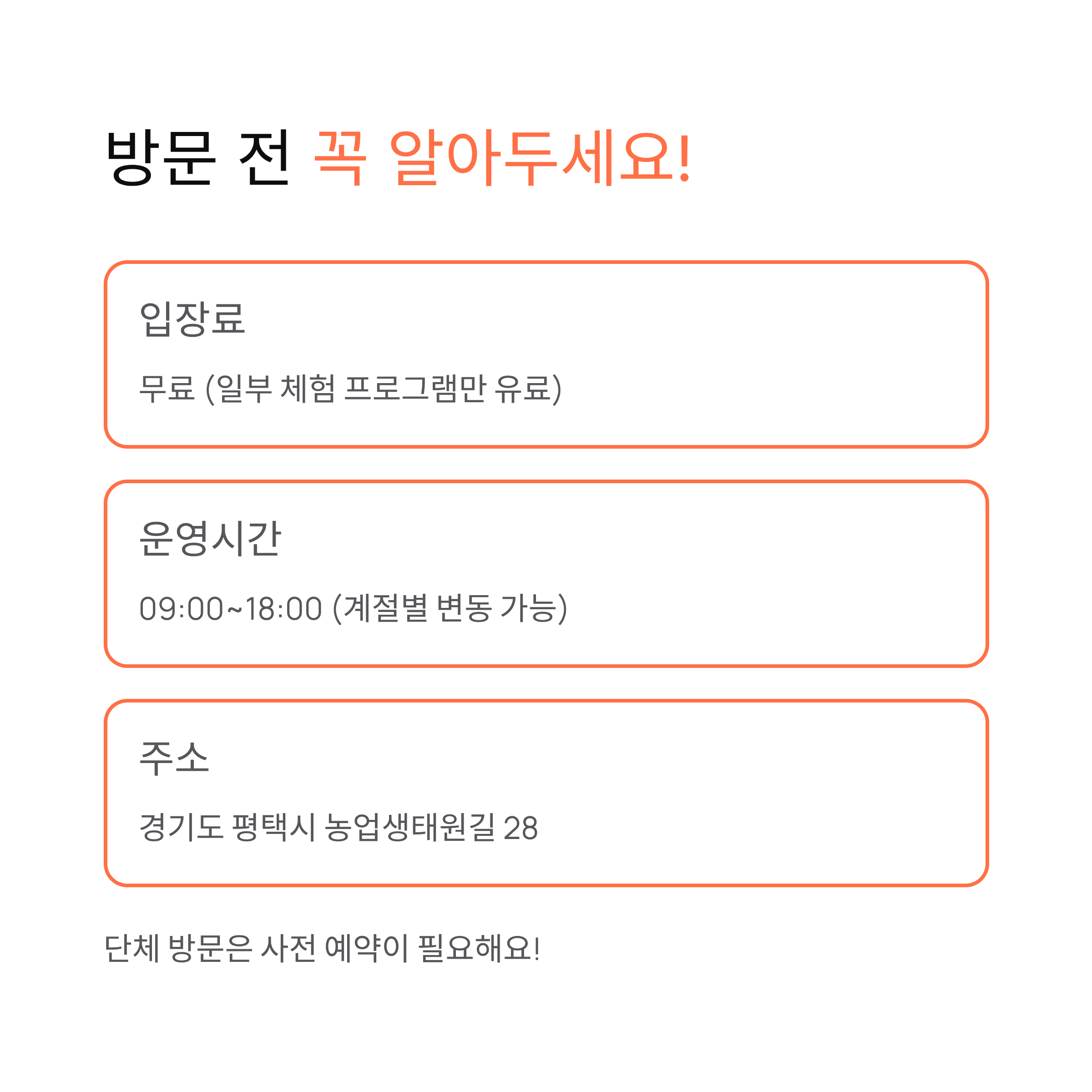입장료는 무료이며 일부 체험 프로그램은 소정의 체험비가 있습니다. 운영 시간은 계절에 따라 달라지므로 방문 전 확인이 필요합니다. 자세한 안내는 평택시 농업생태원 공식 사이트에서 확인할 수 있습니다.