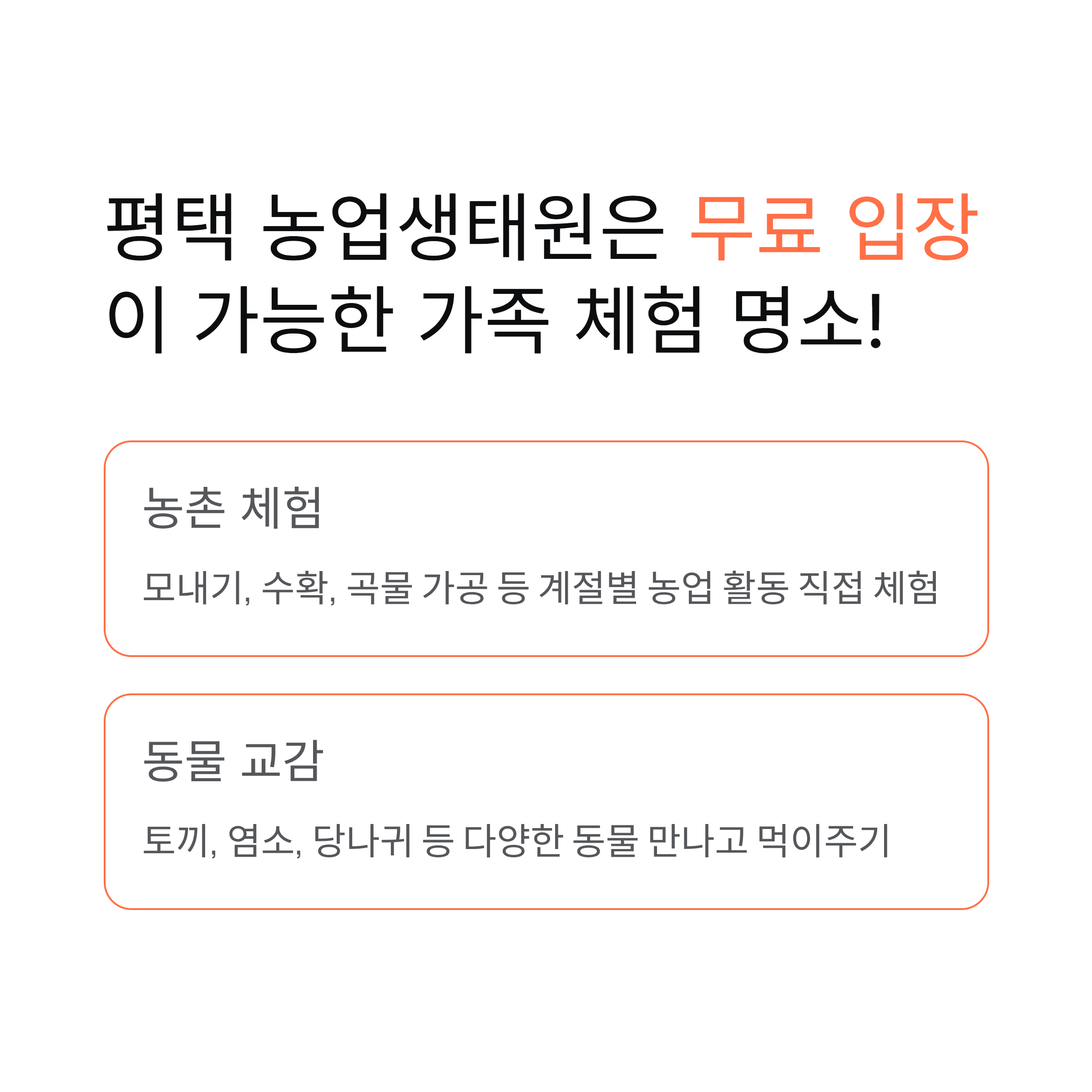 평택 농업생태원은 넓은 잔디광장과 산책로, 어린이 체험장이 있어 가족 단위 방문객에게 적합합니다. 도시 근교라 접근성도 좋아 주말 나들이 코스로 꾸준히 사랑받고 있습니다.