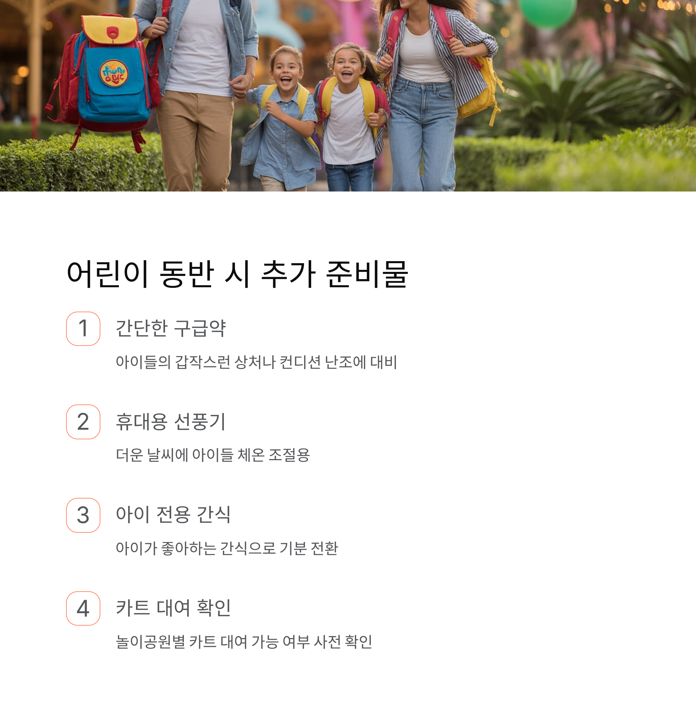 아이들과 함께라면 간단한 구급약, 휴대용 선풍기, 아이 전용 물병이나 간식도 챙겨야 합니다.
