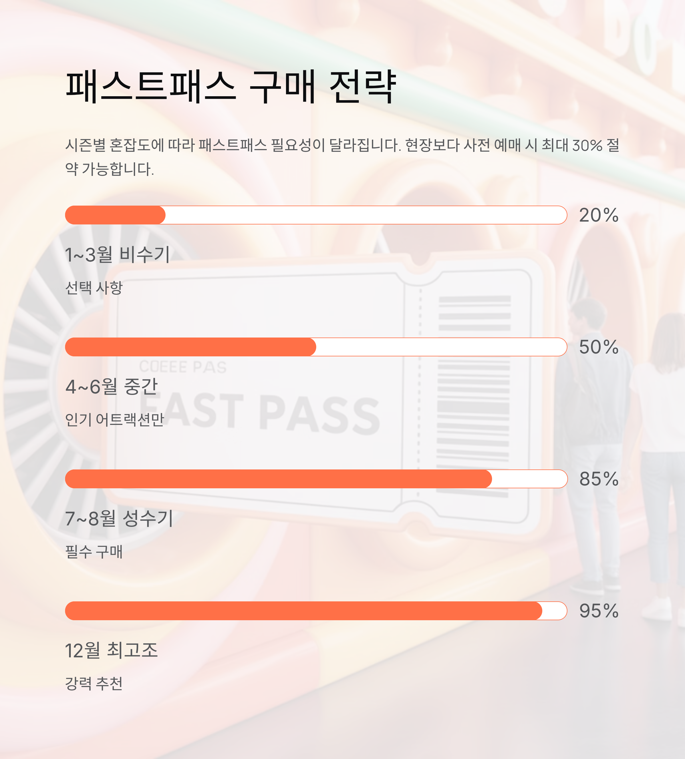| 4~6월 | 중간 | 인기 어트랙션만 구매 |